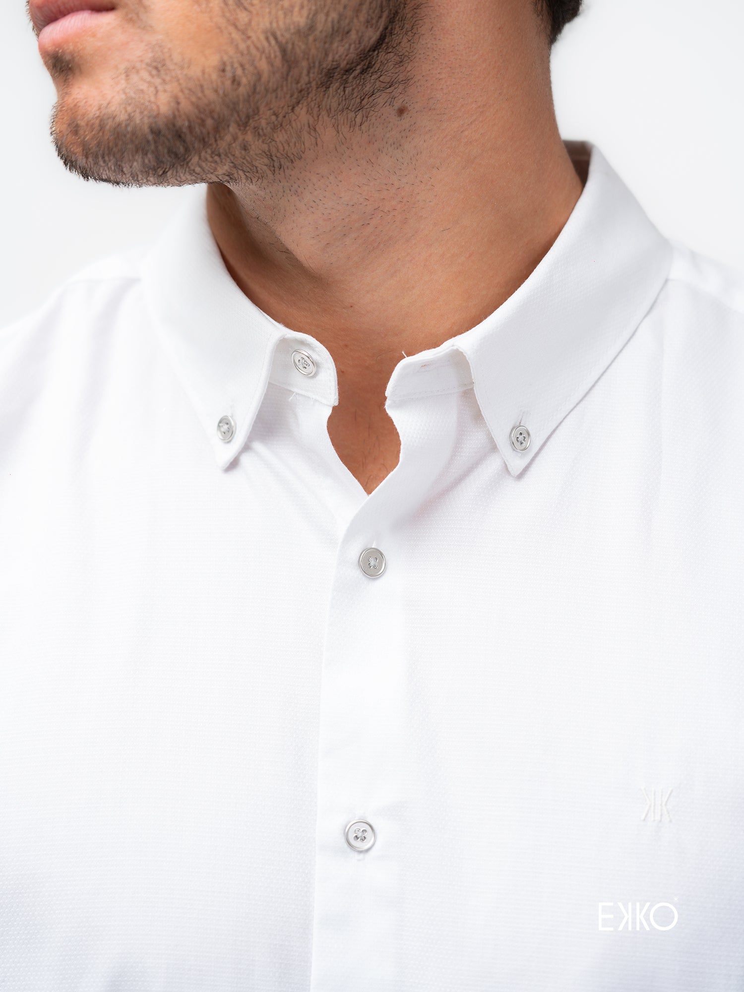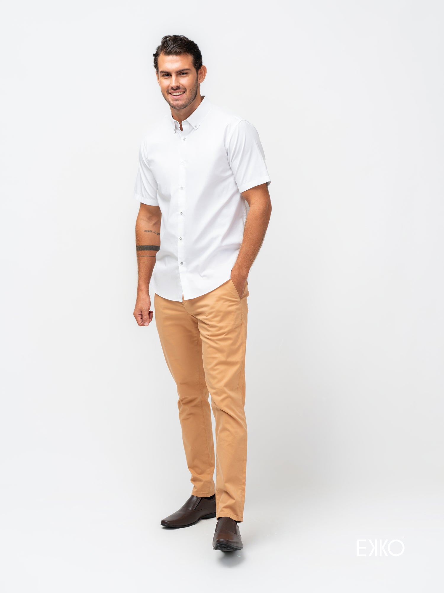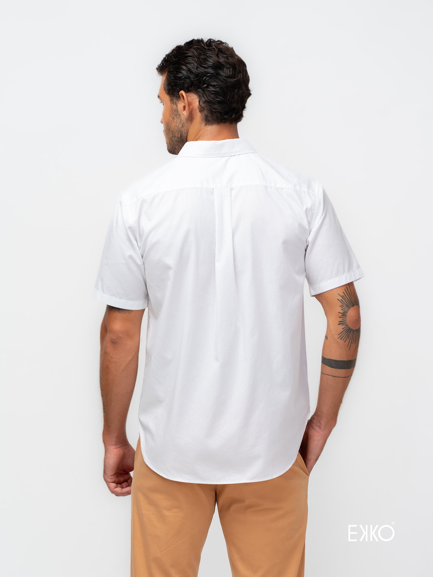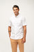 A crisp white, short-sleeve button-down shirt made from 100% cotton. Features a standard collar and clean tailoring for a breathable, polished look—perfect for smart-casual outfits.