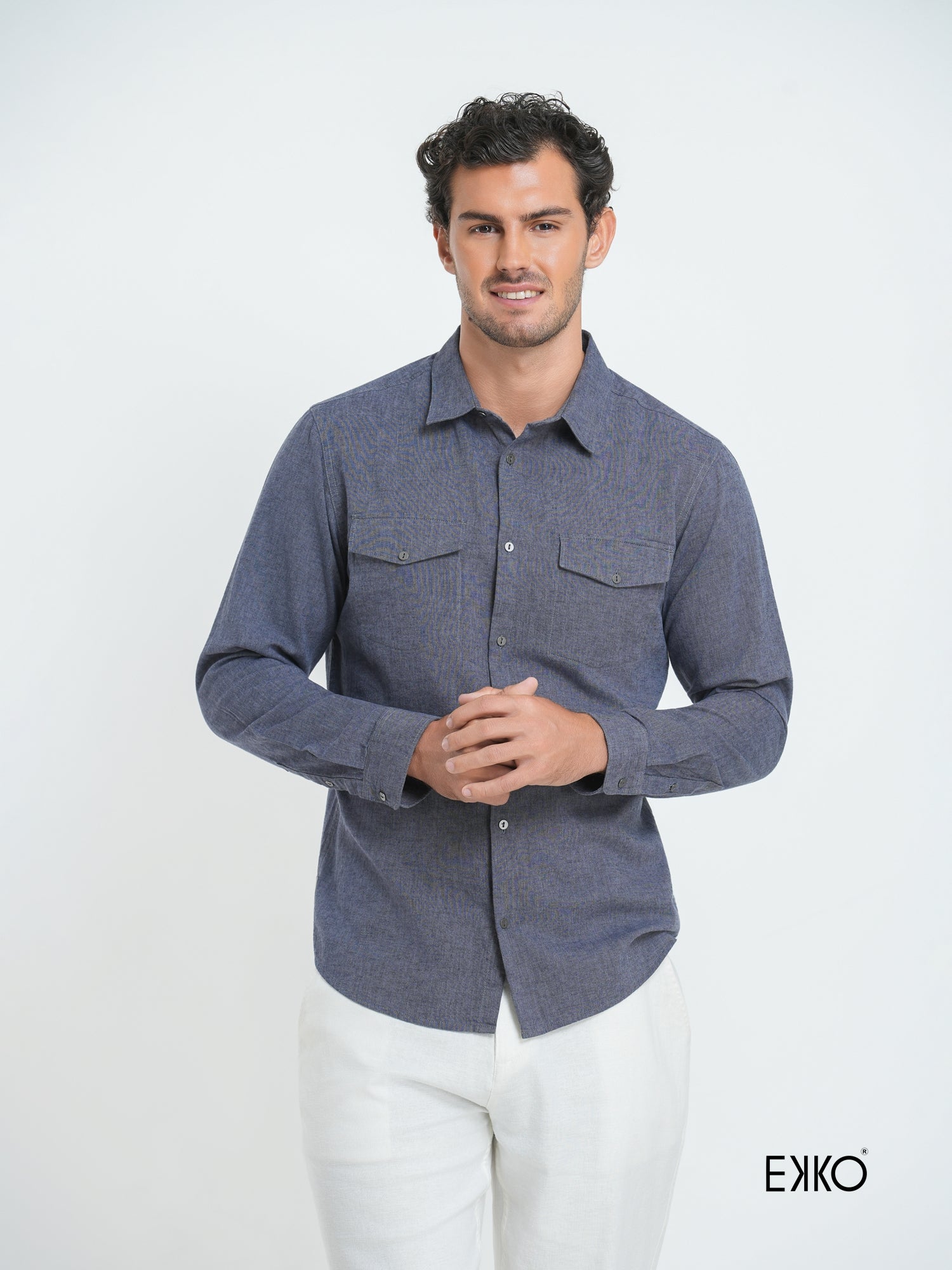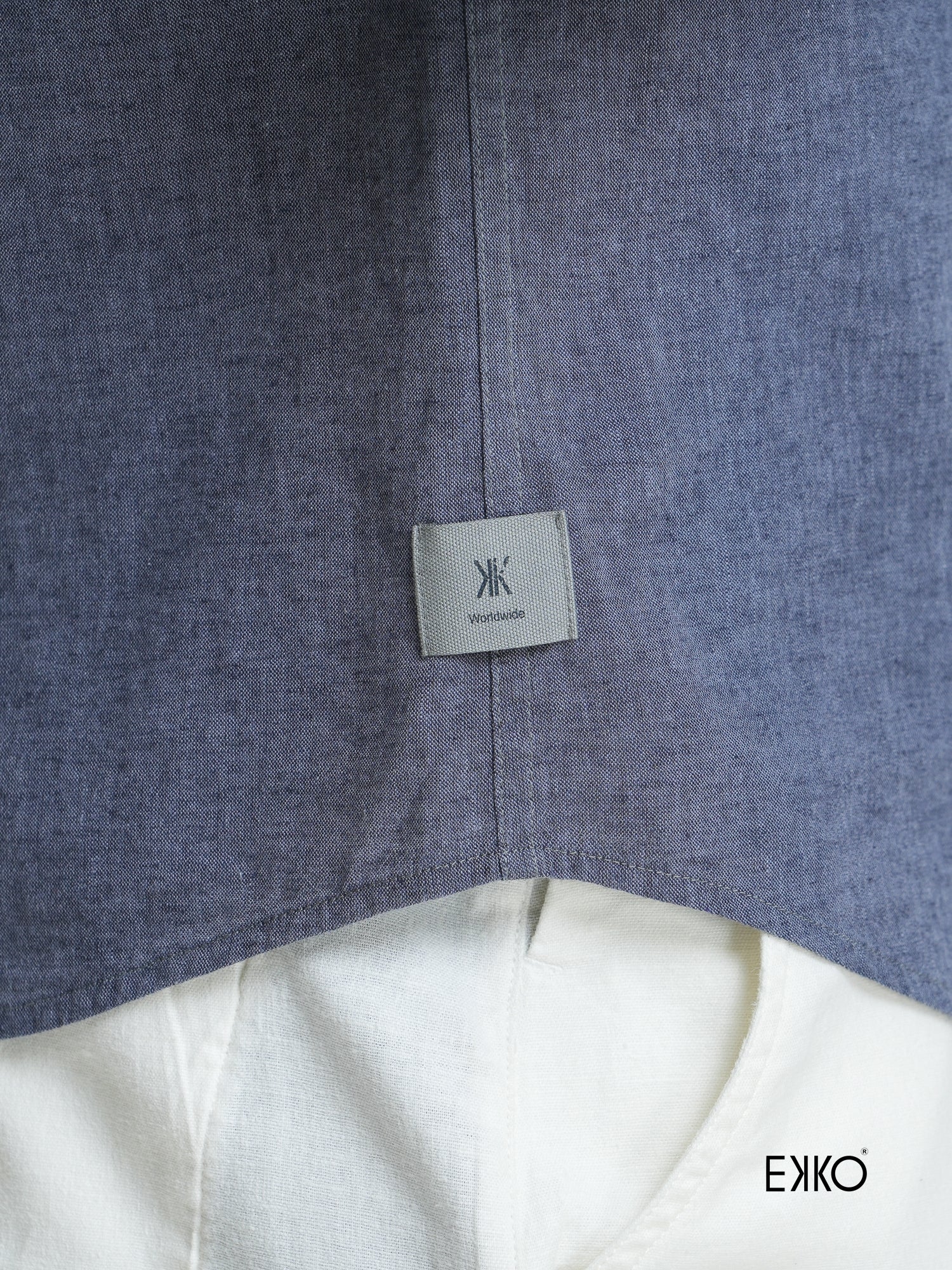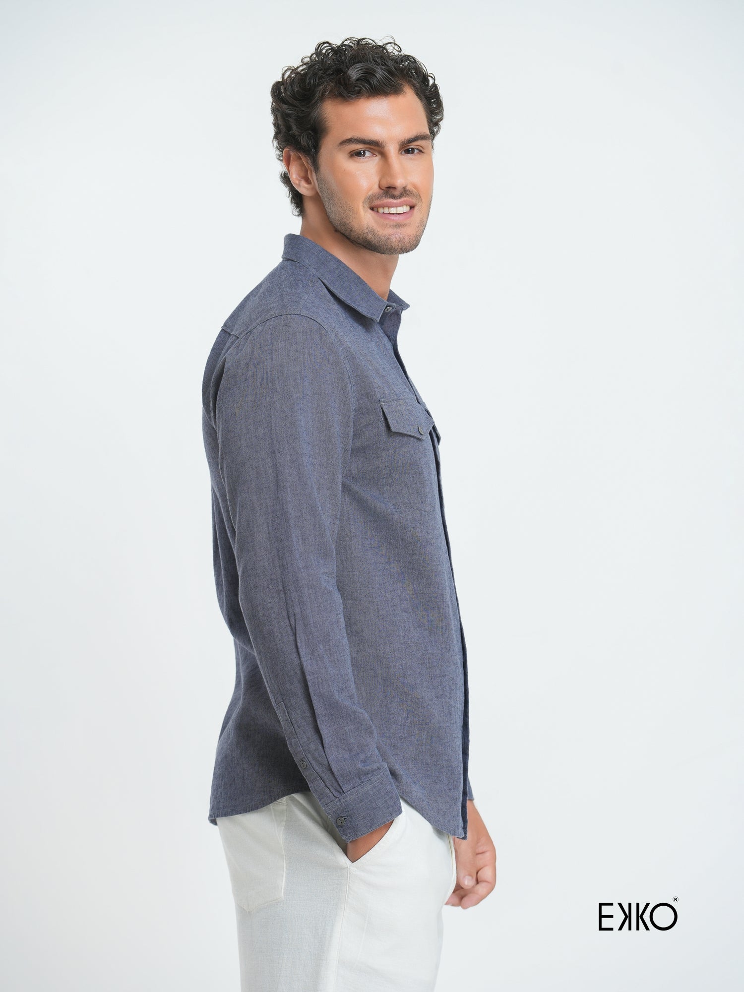 This slim fit grey chambray shirt combines the breathable texture of linen with the softness of cotton for all-day comfort. Featuring a classic standard collar, button-front closure, and two sleek welt pockets, it blends functional details with a modern, tailored silhouette—perfect for smart-casual styling.