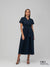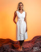 A white midi dress with grown-up sleeves turned up and a tie-up detail adds a chic, playful touch to a timeless silhouette. The relaxed fit and elegant tie accentuate the waist, making it a perfect blend of casual ease and refined style.