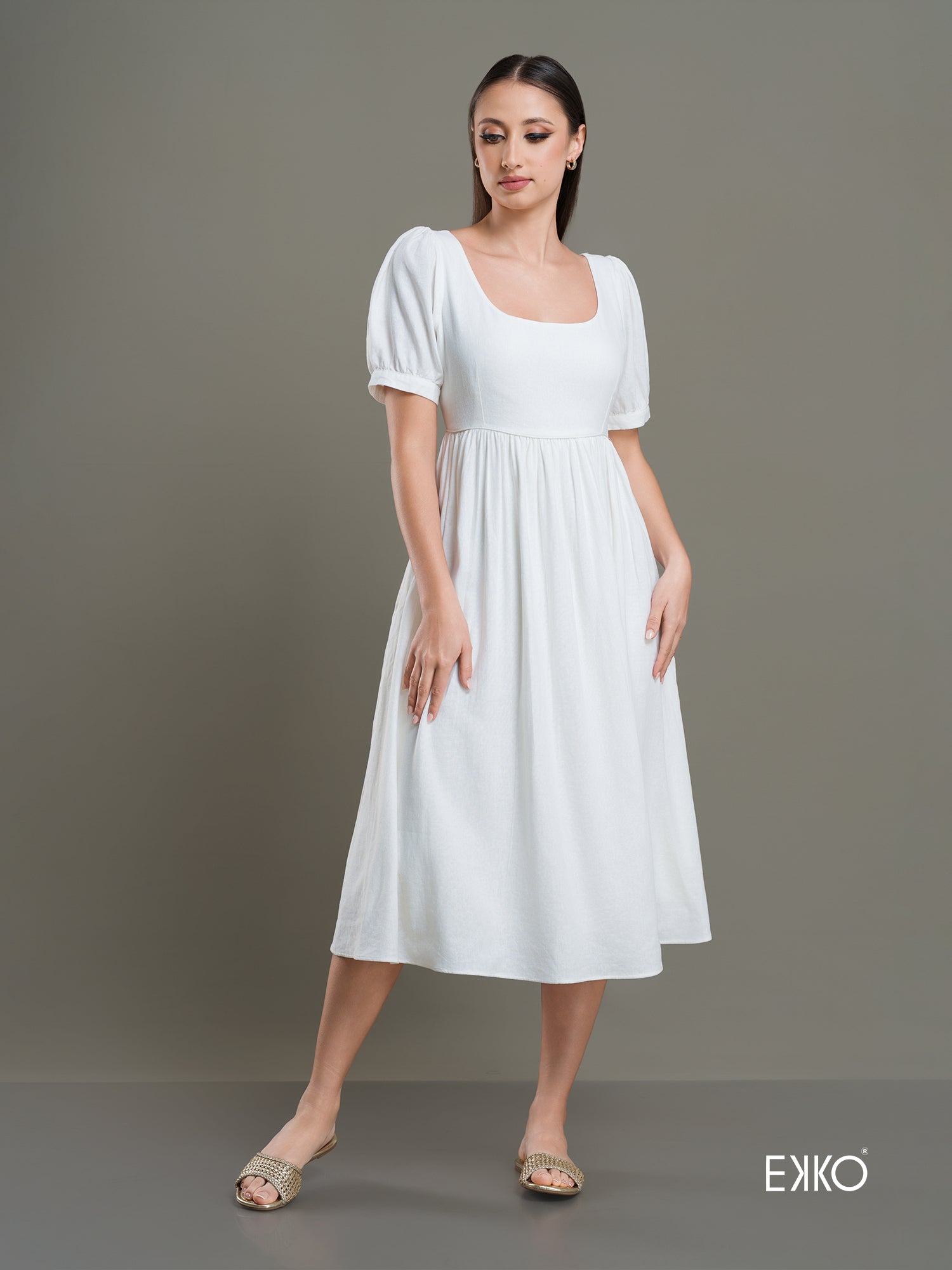 Effortlessly feminine and timeless, the Lucy Midi Dress features a flattering fit-and-flare silhouette with short puff sleeves for a soft, romantic touch. Designed with side seam pockets for everyday ease, this crisp white midi is perfect for casual days, brunch plans, and relaxed outings in style.