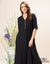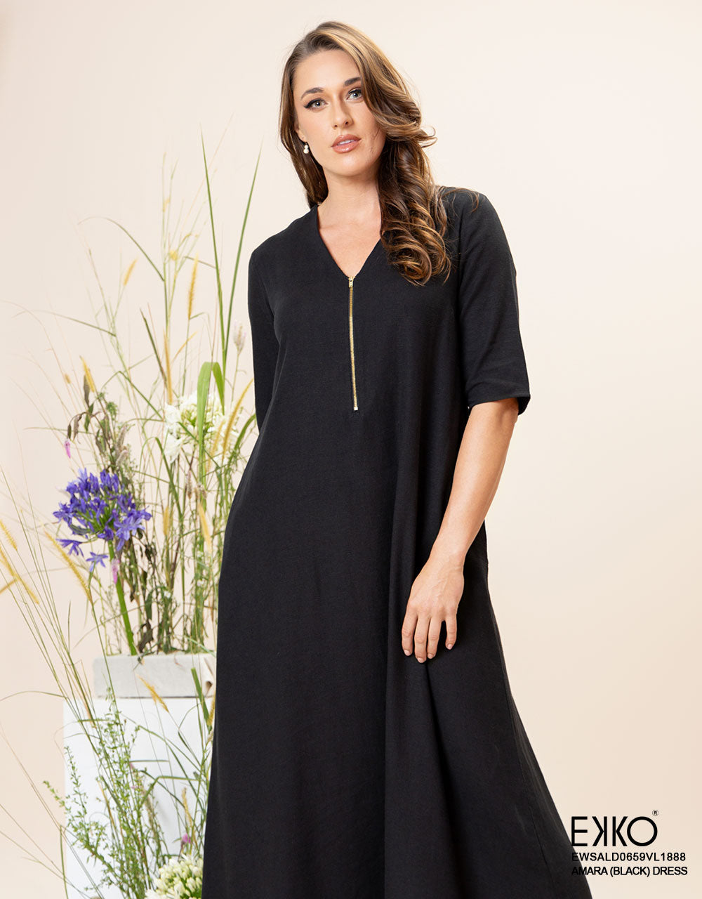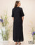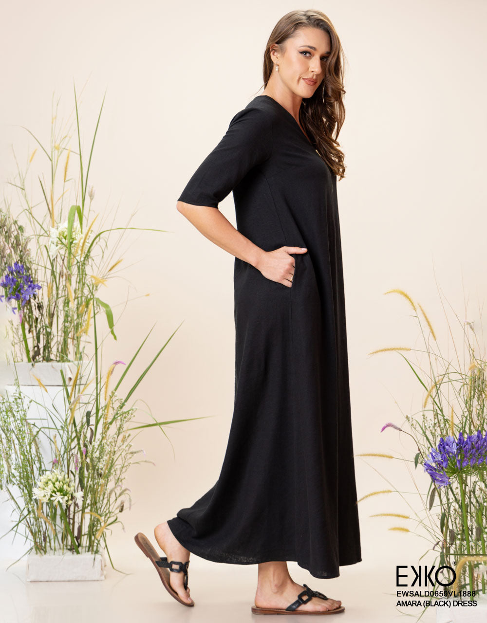 A timeless maxi dress featuring a flattering V-neckline, three-quarter sleeves, and a sleek mandarin collar. Effortlessly stylish, it's the perfect piece for any occasion.