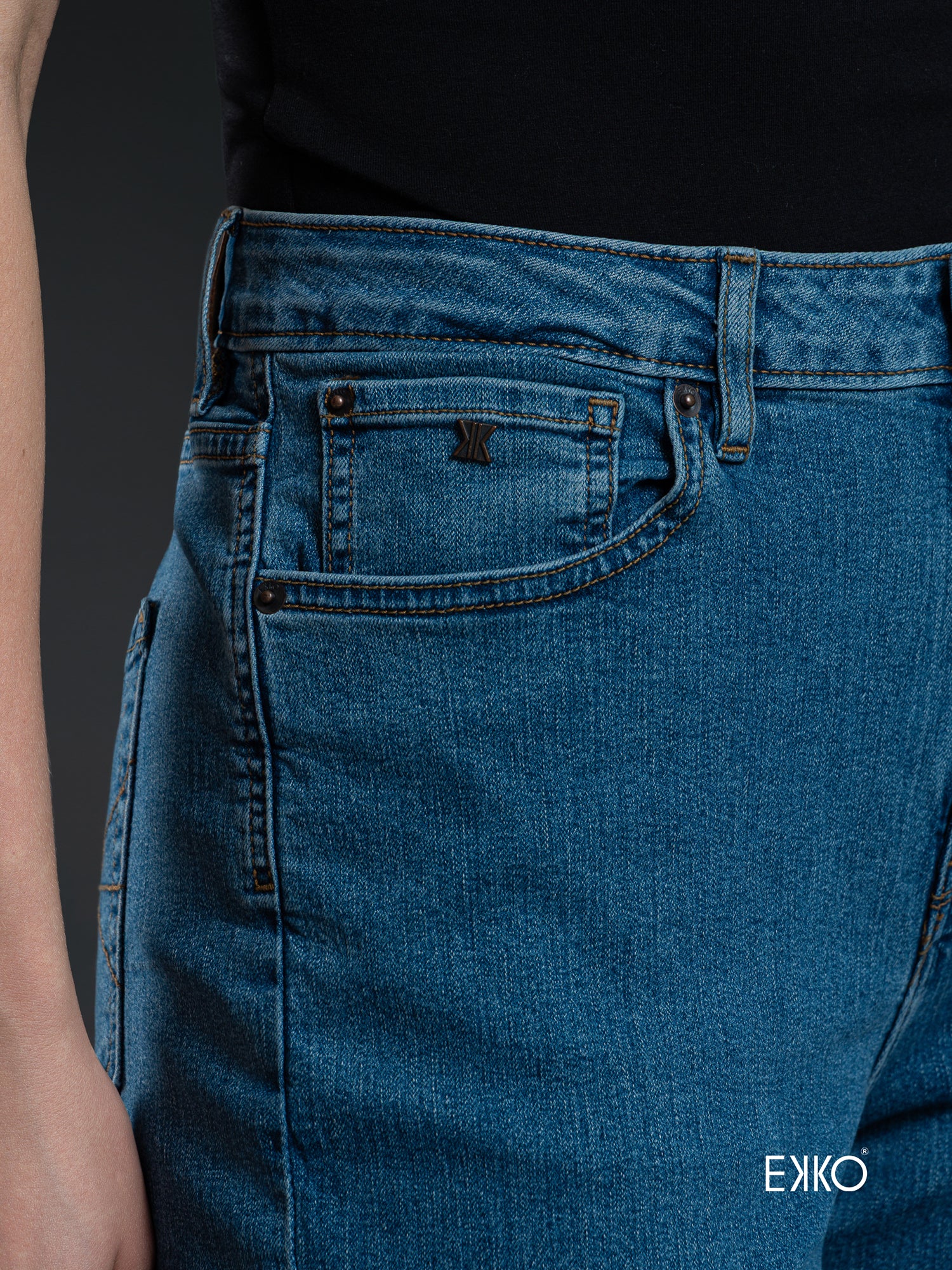 Crafted in a modern Denim jeans, these denim pants balance everyday comfort with smart casual appeal. Designed with a sleek silhouette, they feature an eco-conscious apple peel PU patch for a refined finish, metal shanks for durability, and signature metal KK tabs that add a contemporary edge. Versatile and effortless, they’re a go-to piece that transitions seamlessly from daily wear to smart casual occasions.