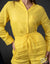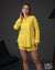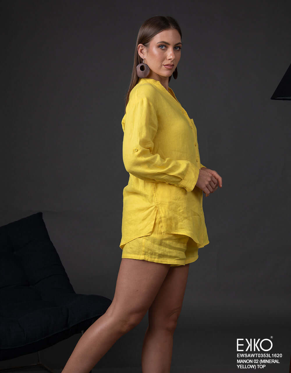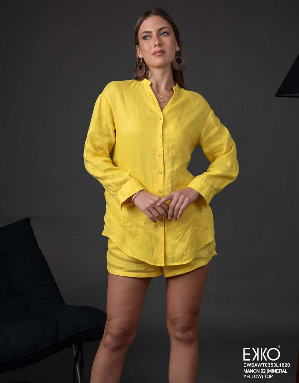 A chic linen set in mineral yellow, featuring an oversized mandarin-collar shirt with a button-down front, one side pocket, and long-tab sleeves. Paired with relaxed shorts designed with side-seam pockets and an adjustable fabric tie waistband. Perfect for effortless resort wear and laid-back style.