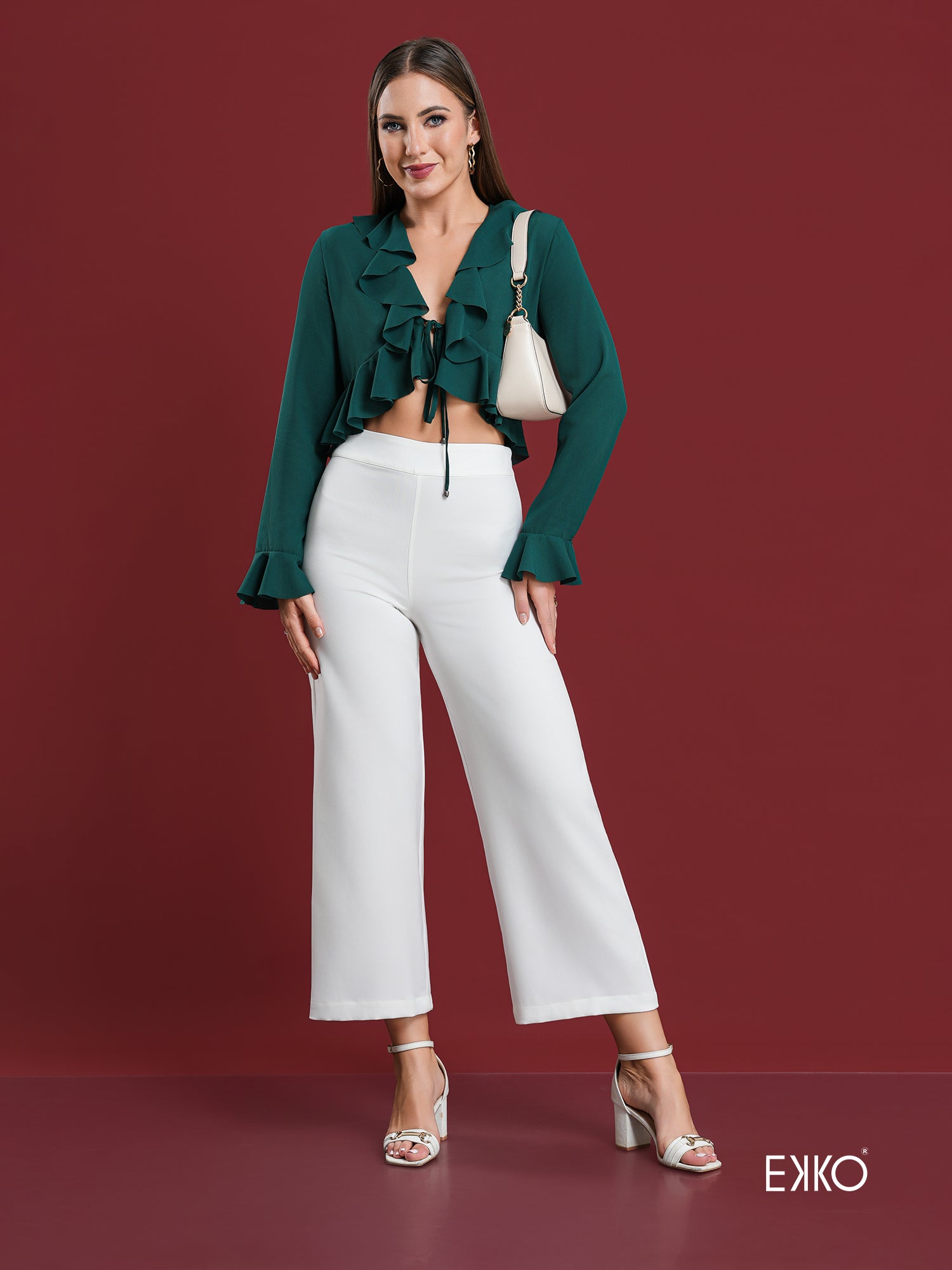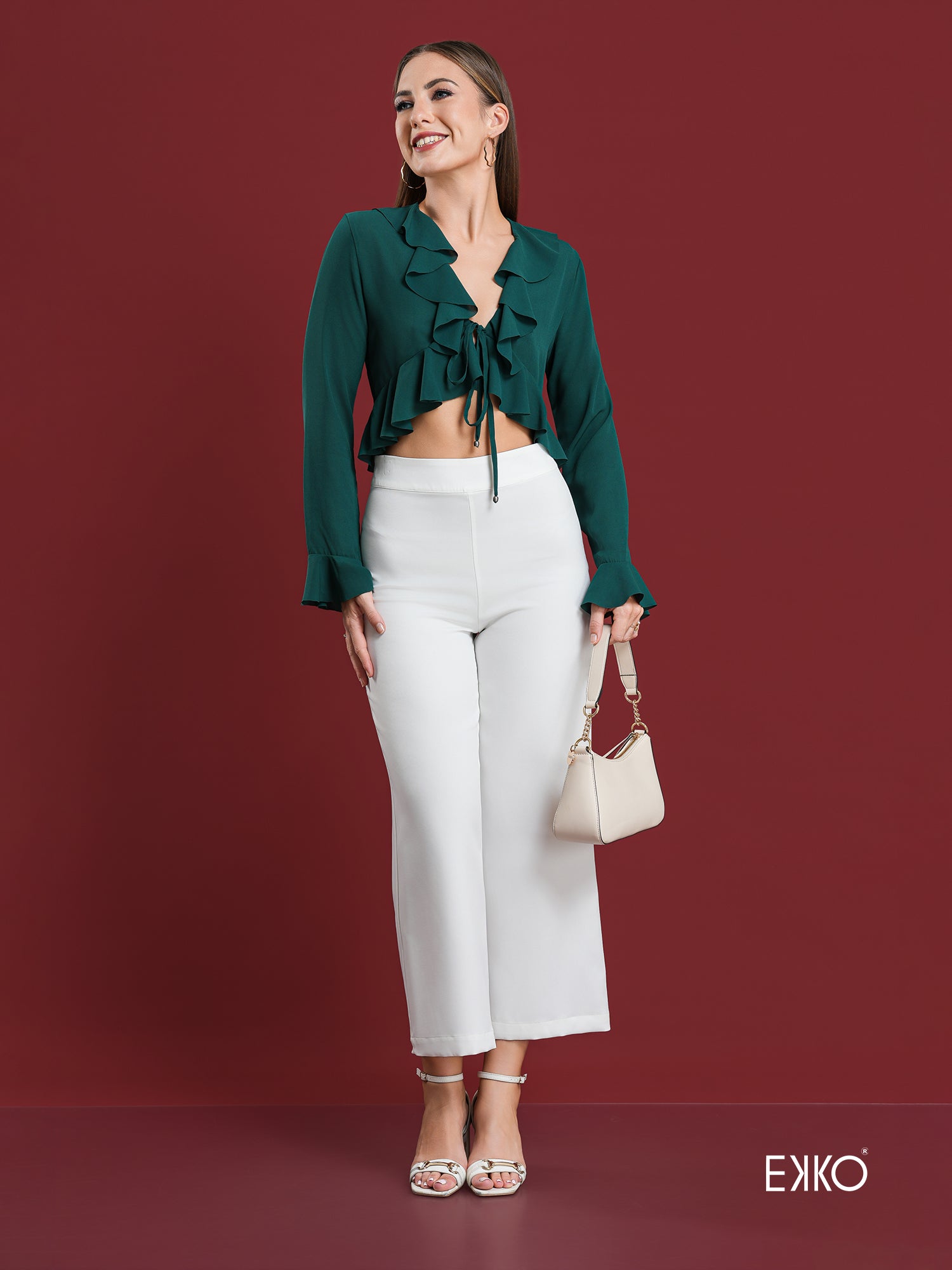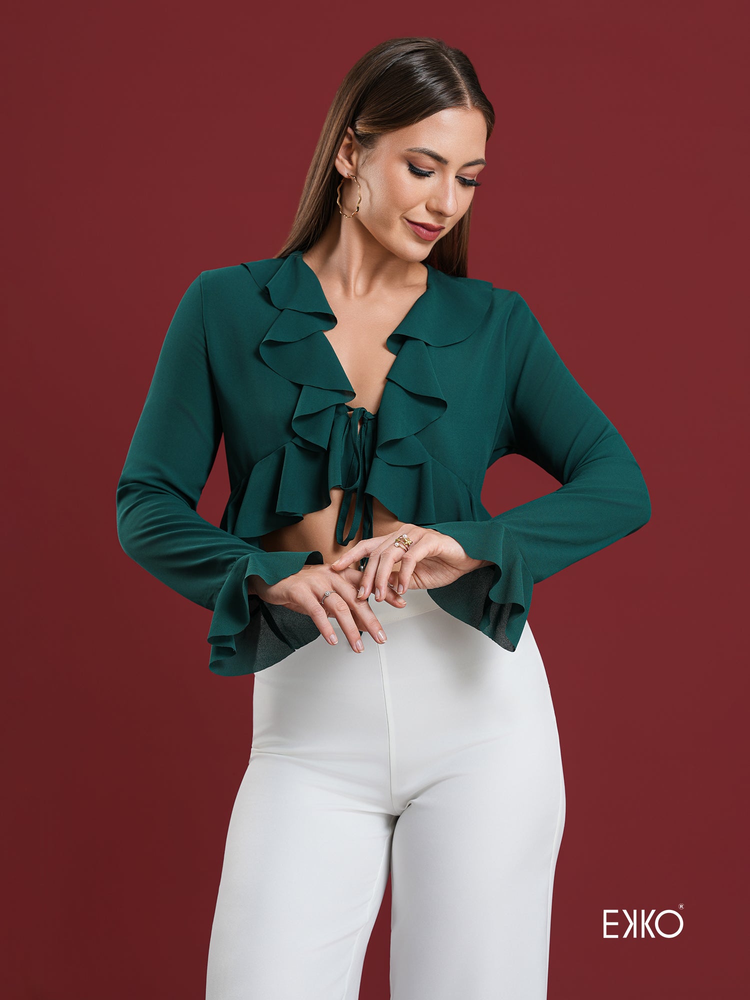 A stylish long-sleeve top featuring delicate frill detailing for a soft, feminine touch—perfect for effortless everyday elegance.