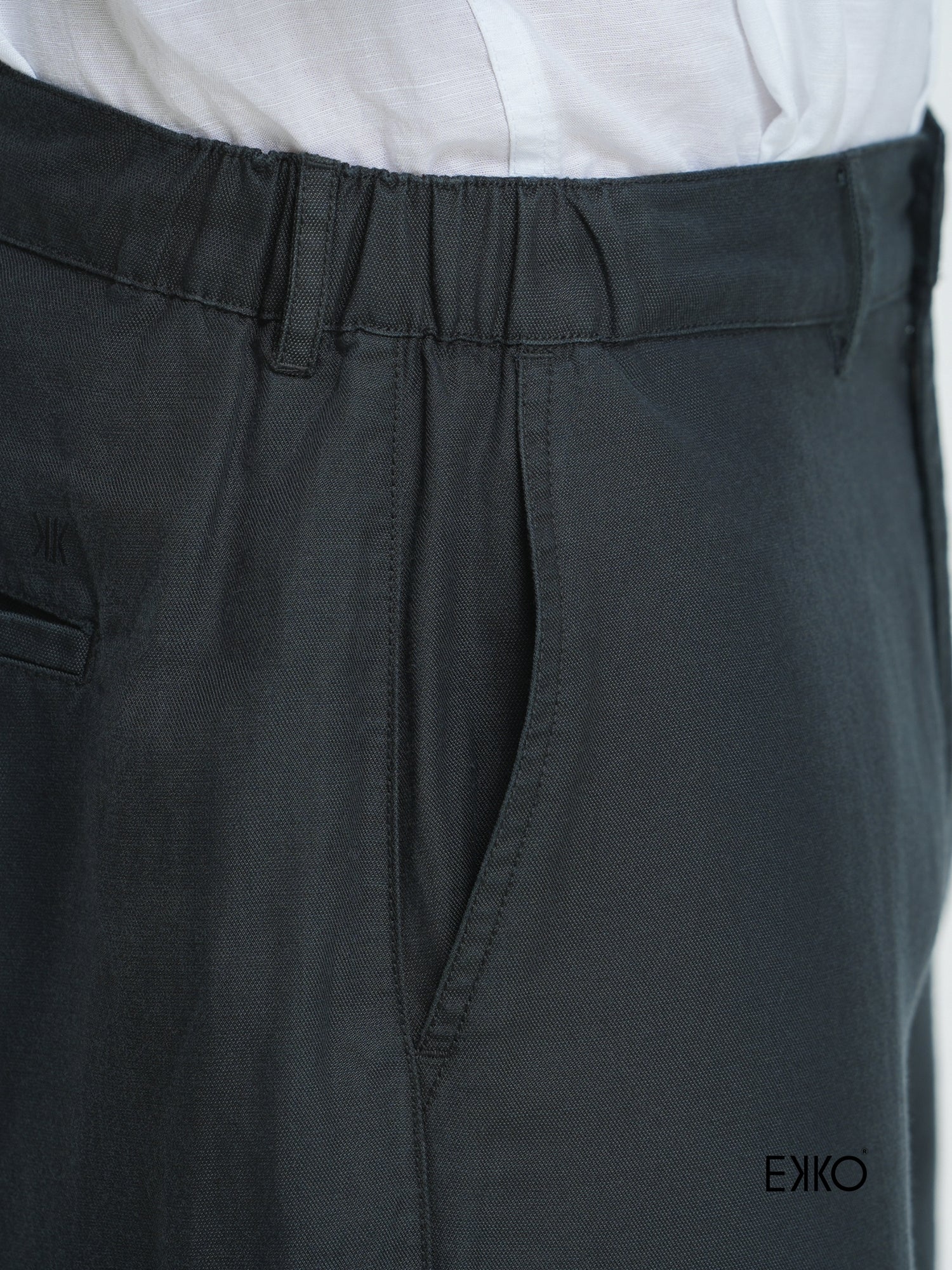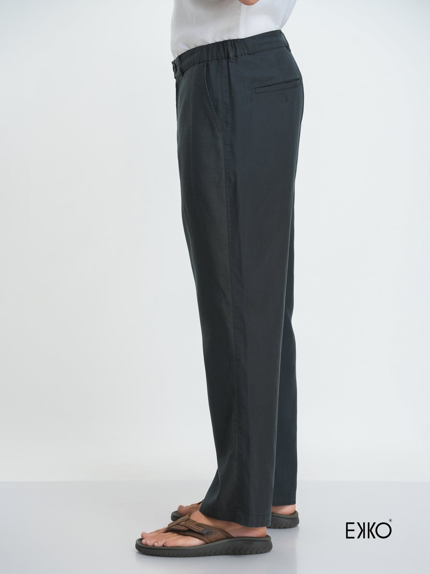 These black pants combine the natural softness of a lyocell linen blend with practical design details. Featuring elasticated sides for flexible comfort, slant pockets at the front, and welt pockets at the back, they offer a sleek silhouette with effortless wearability—perfect for smart-casual or relaxed looks.