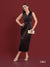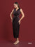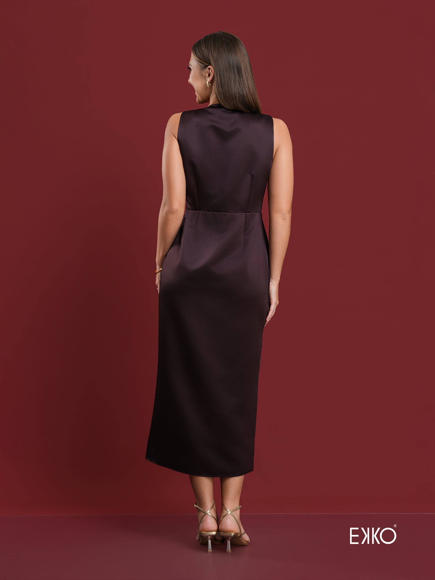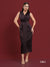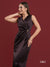A dark brown, tight-fit maxi dress featuring a sleek V-neckline and sleeveless silhouette. Designed with a non-functional wrap detail accented by a gold buckle, this piece brings effortless elegance to party and evening wear.