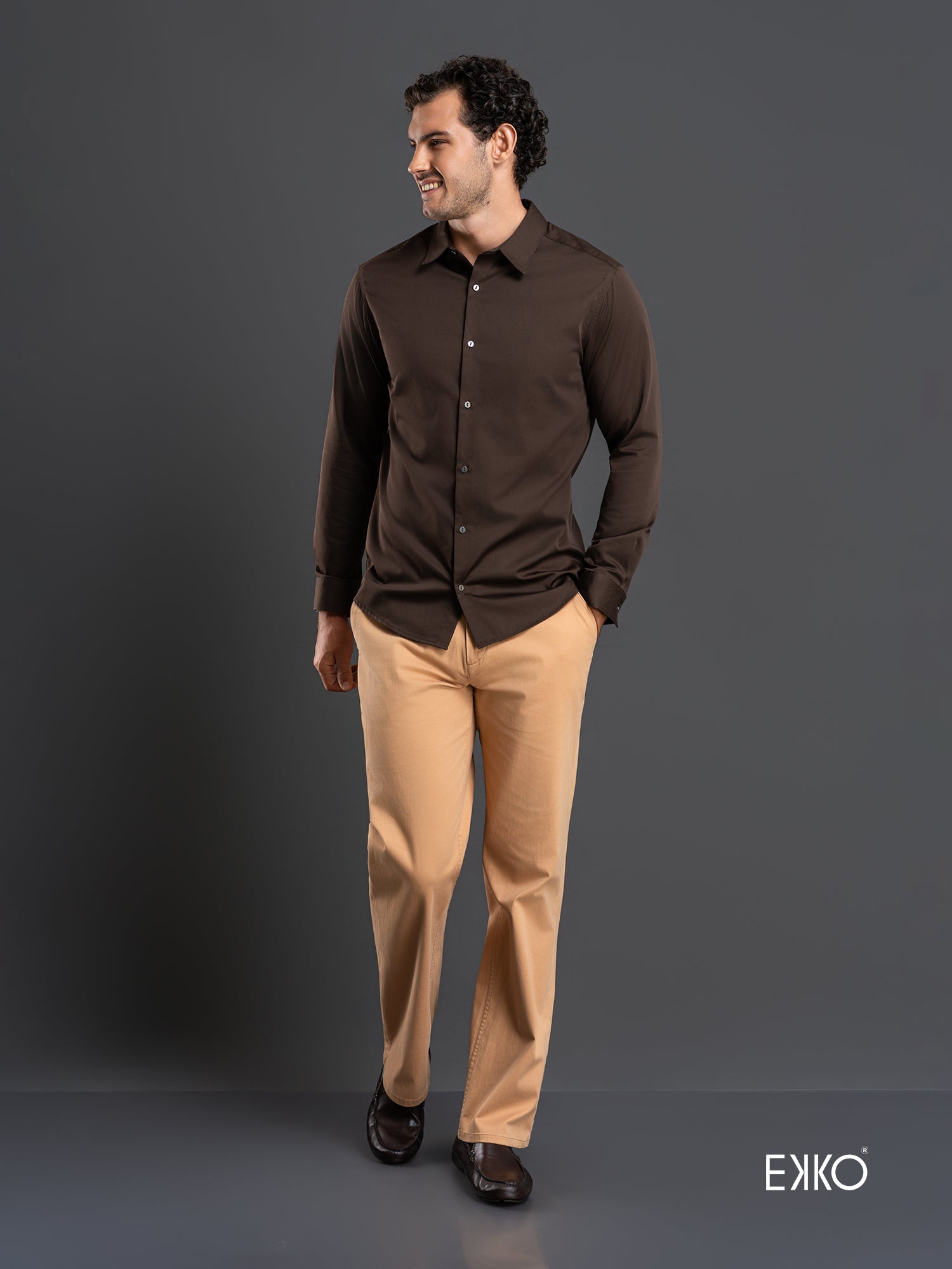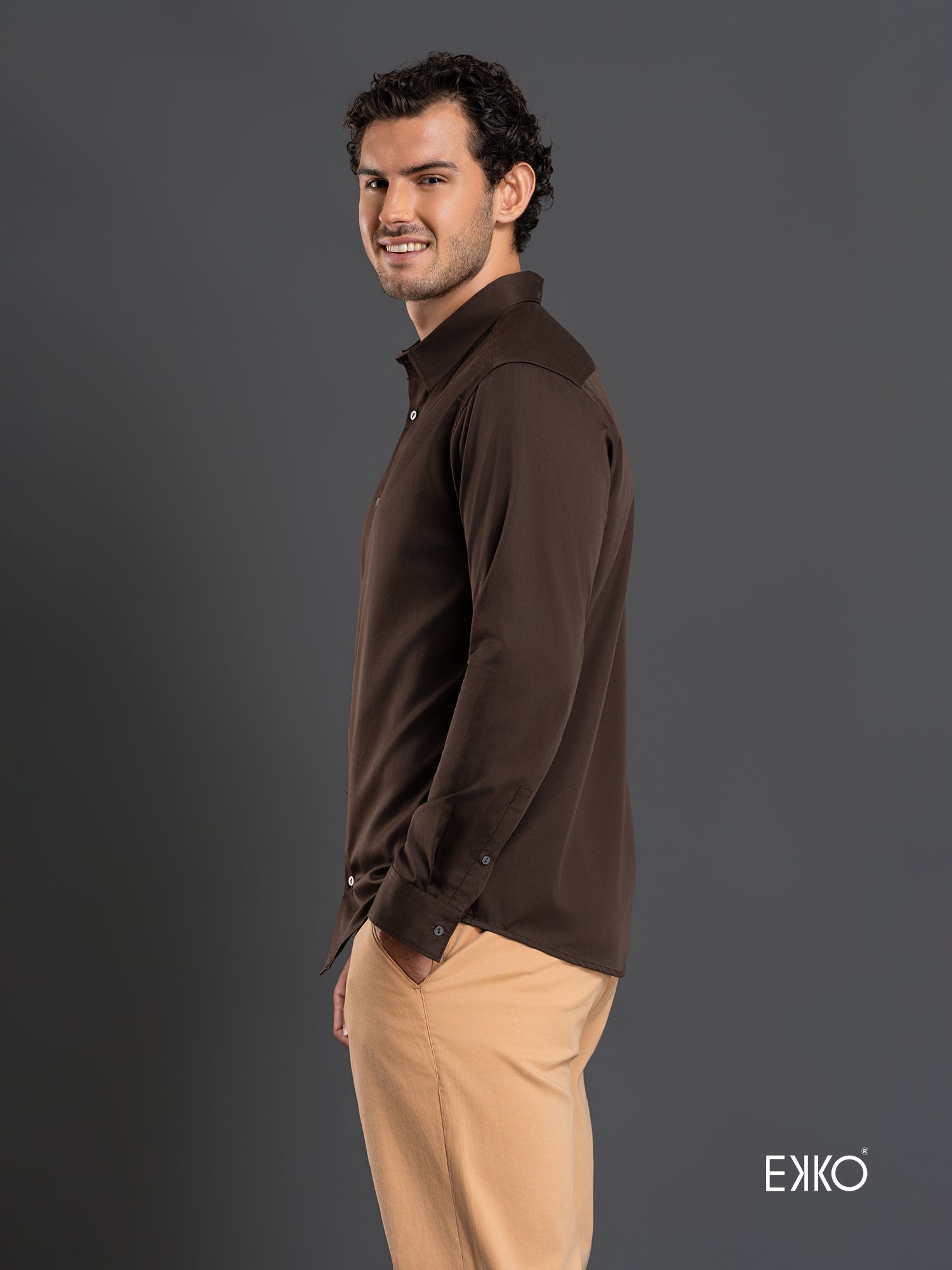 Brown long-sleeve slim-fit shirt crafted from 100% cotton, featuring a standard collar and a smooth, breathable feel. Designed with a tailored silhouette that offers a refined look while remaining comfortable for everyday wear.
