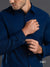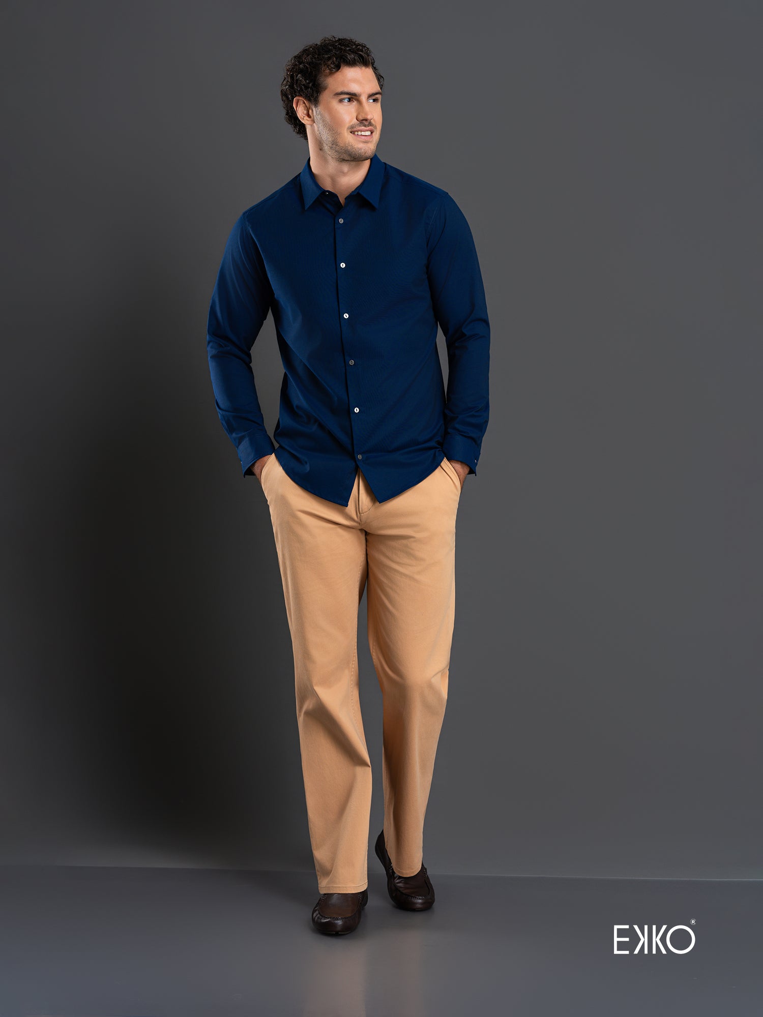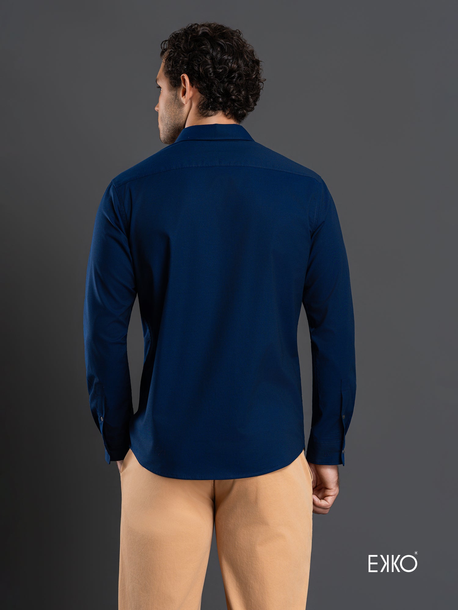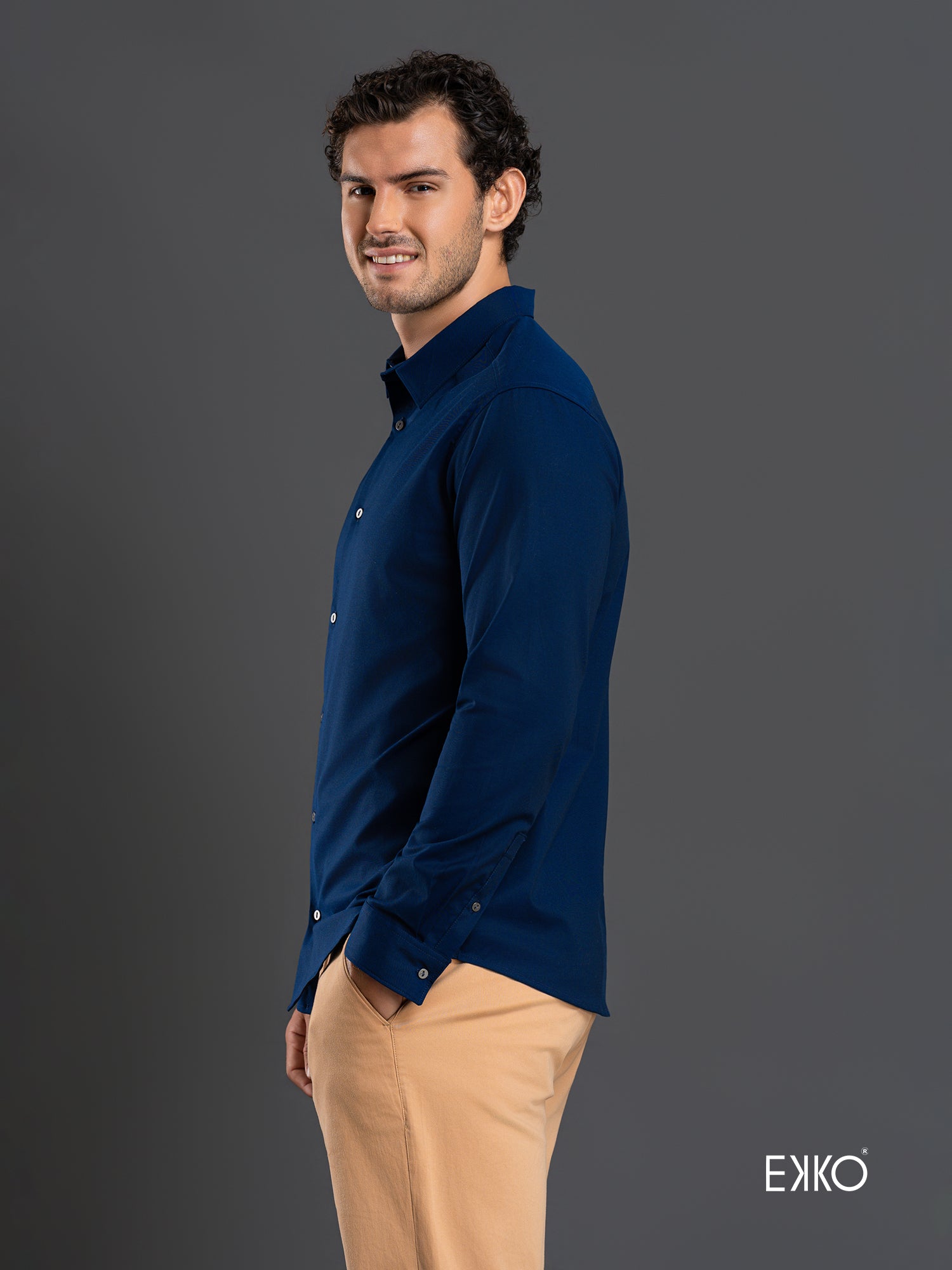 A dark navy long-sleeve shirt crafted from a comfortable cotton and elastane blend, featuring a standard collar for a timeless, versatile look. Designed to offer softness, stretch, and all-day wearability, it delivers a refined silhouette suitable for both casual and smart-casual styling.