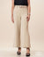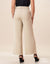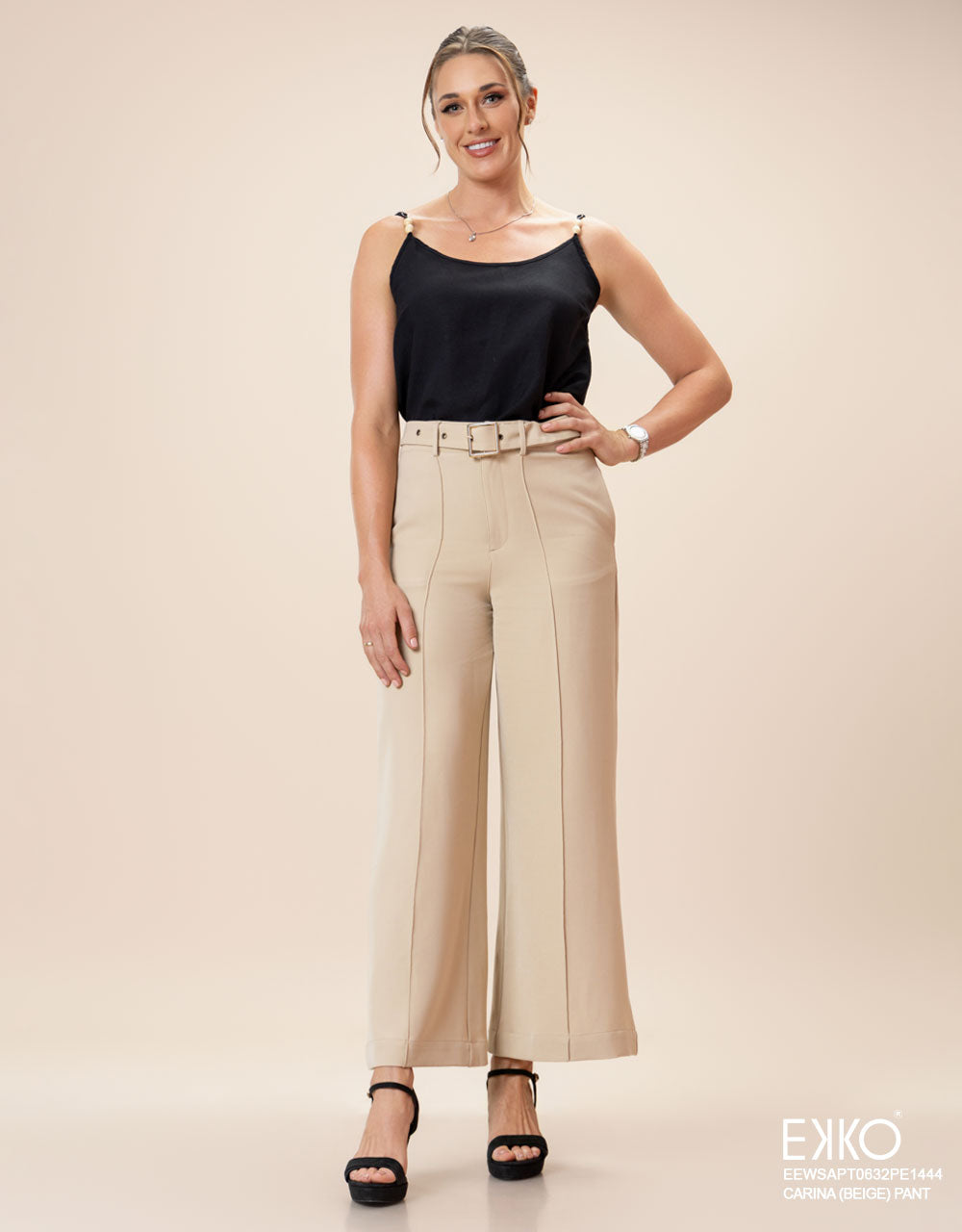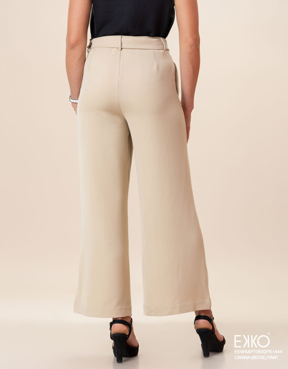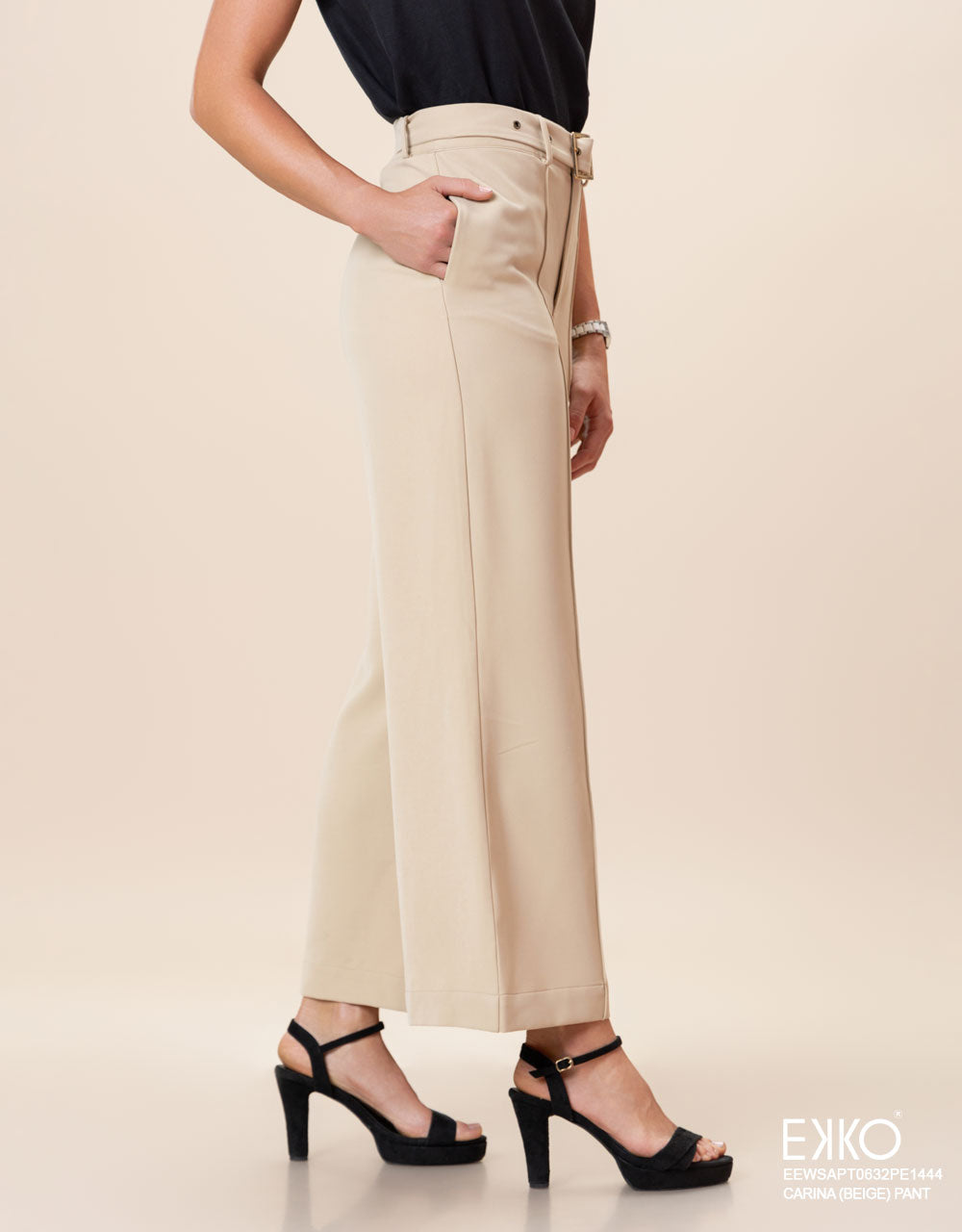 The High-Waisted Beige Bootleg Pant is a refined workwear staple with a gold buckle belt, front pin tuck seams, and a smooth waistband. The bootleg cut adds a modern touch, blending comfort and professionalism for everyday wear.