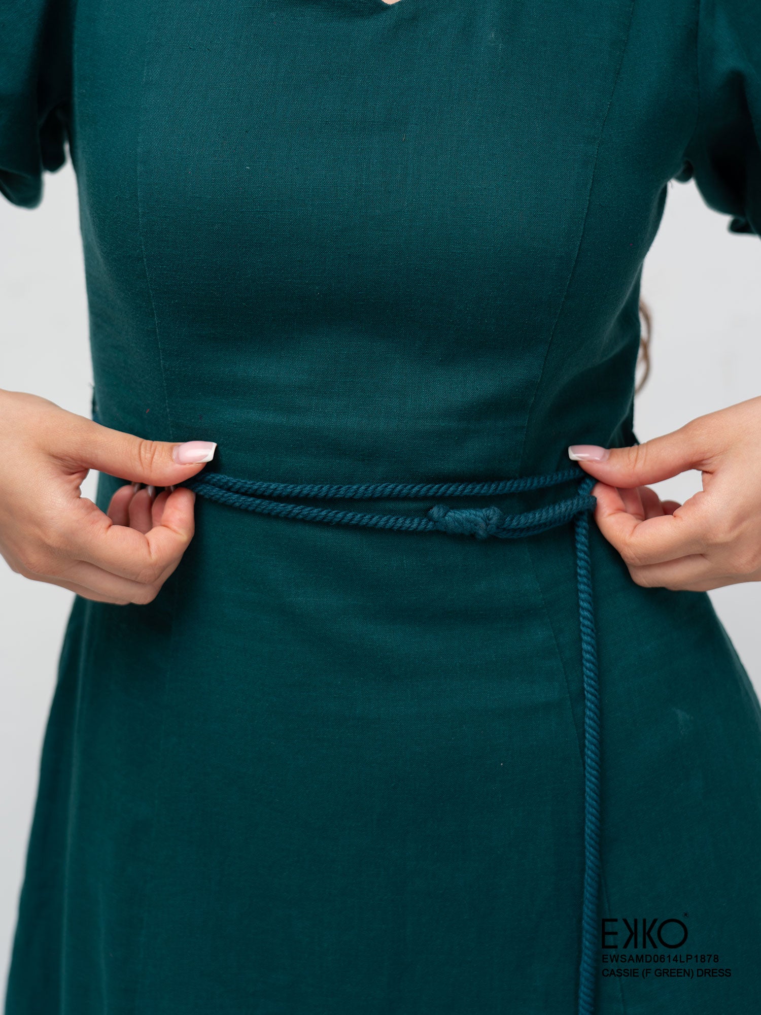 This feminine midi dress features short puffed sleeves and a flattering V-neckline for a chic, romantic look. The braided DTM (Dye to Match) waist tie-up cord allows for an adjustable fit, accentuating your waist and adding a unique detail. The midi length offers an elegant, versatile style, making it perfect for both casual and semi-formal occasions. Made from soft, breathable fabric, this dress combines comfort with a touch of sophistication.