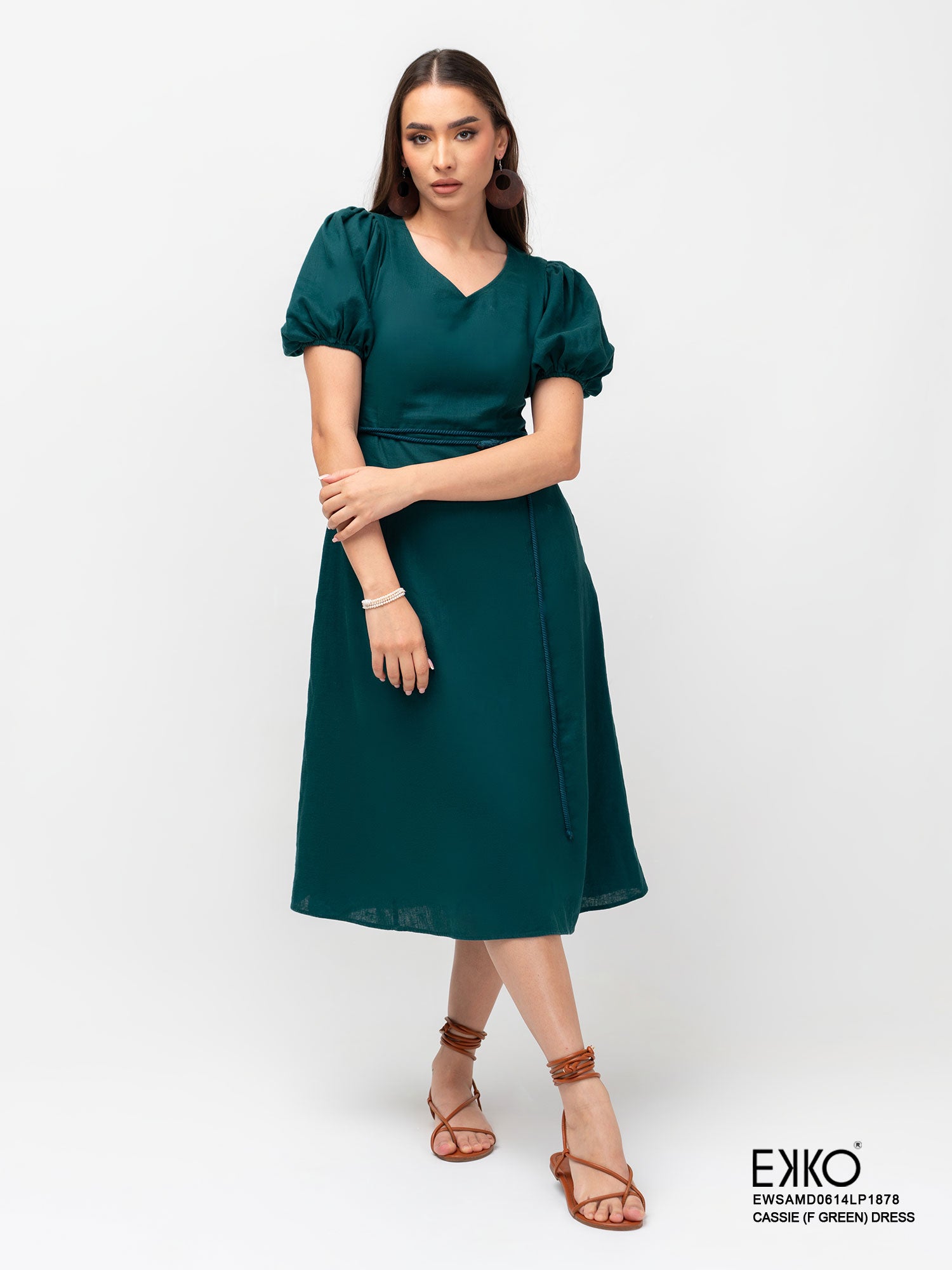 V NECKLINE PUFF SLEEVE MIDI DRESS