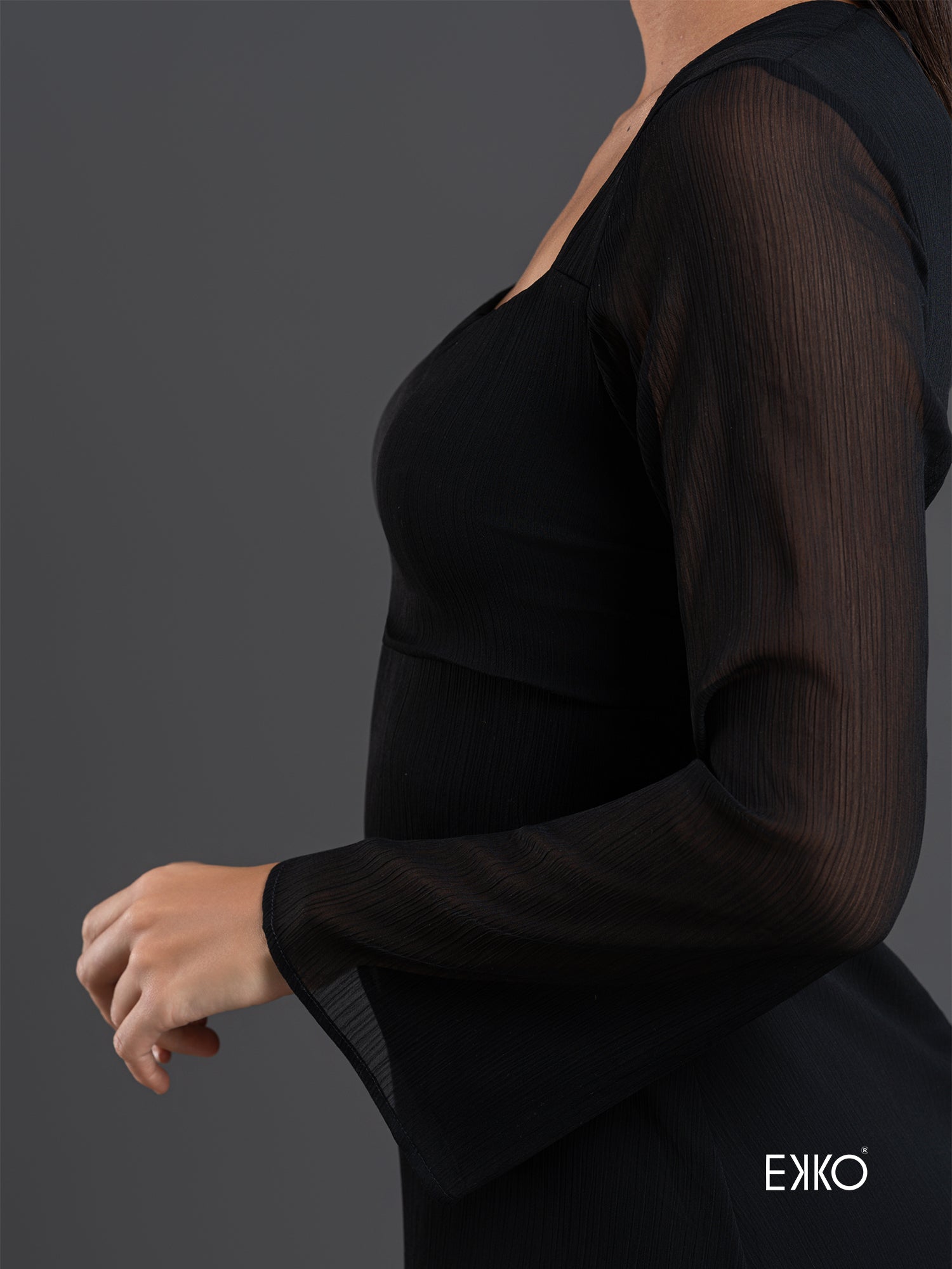 A delicate mini dress with long sheer sleeves, offering a subtle, elegant look with lightweight, airy detailing.