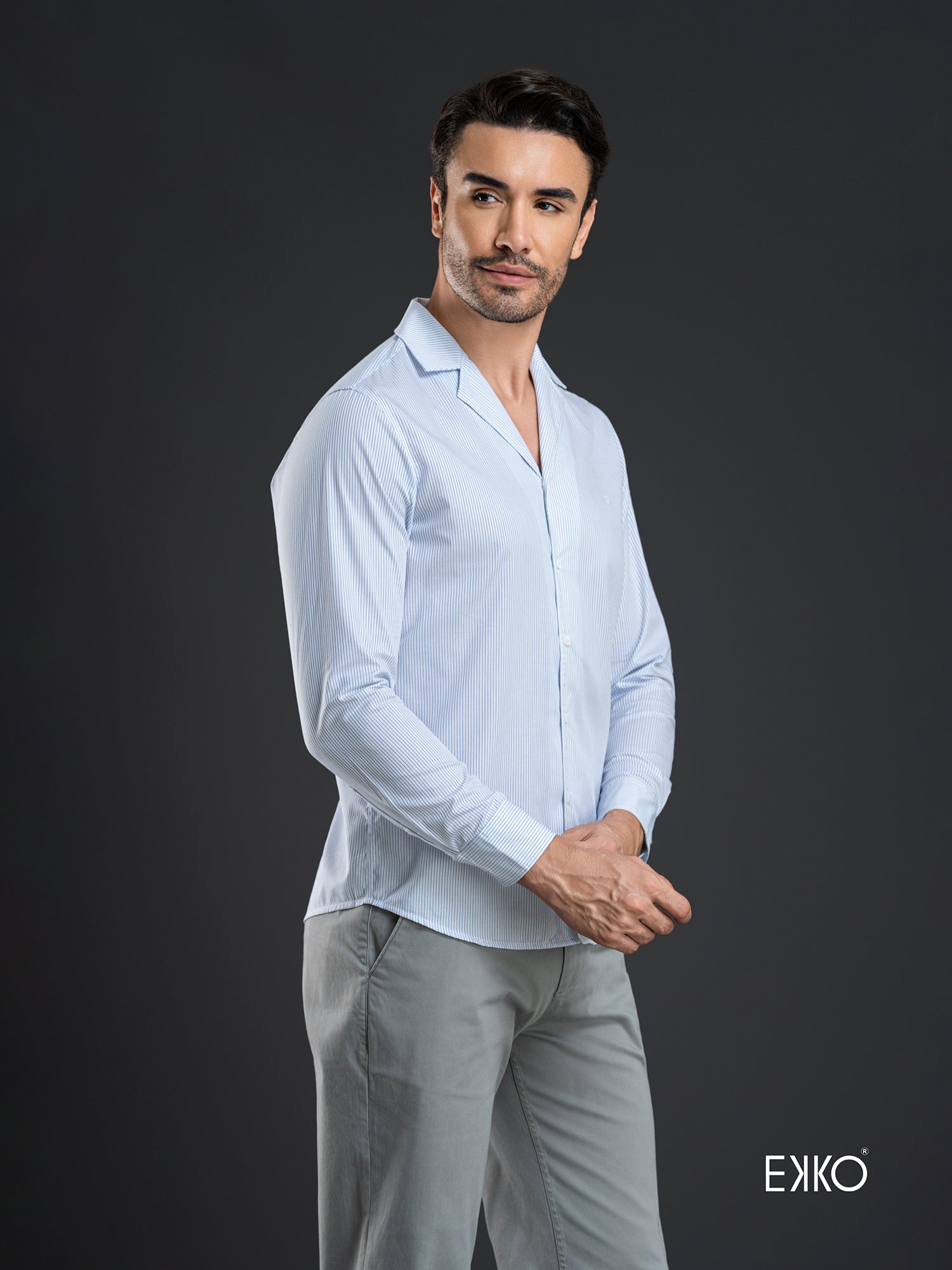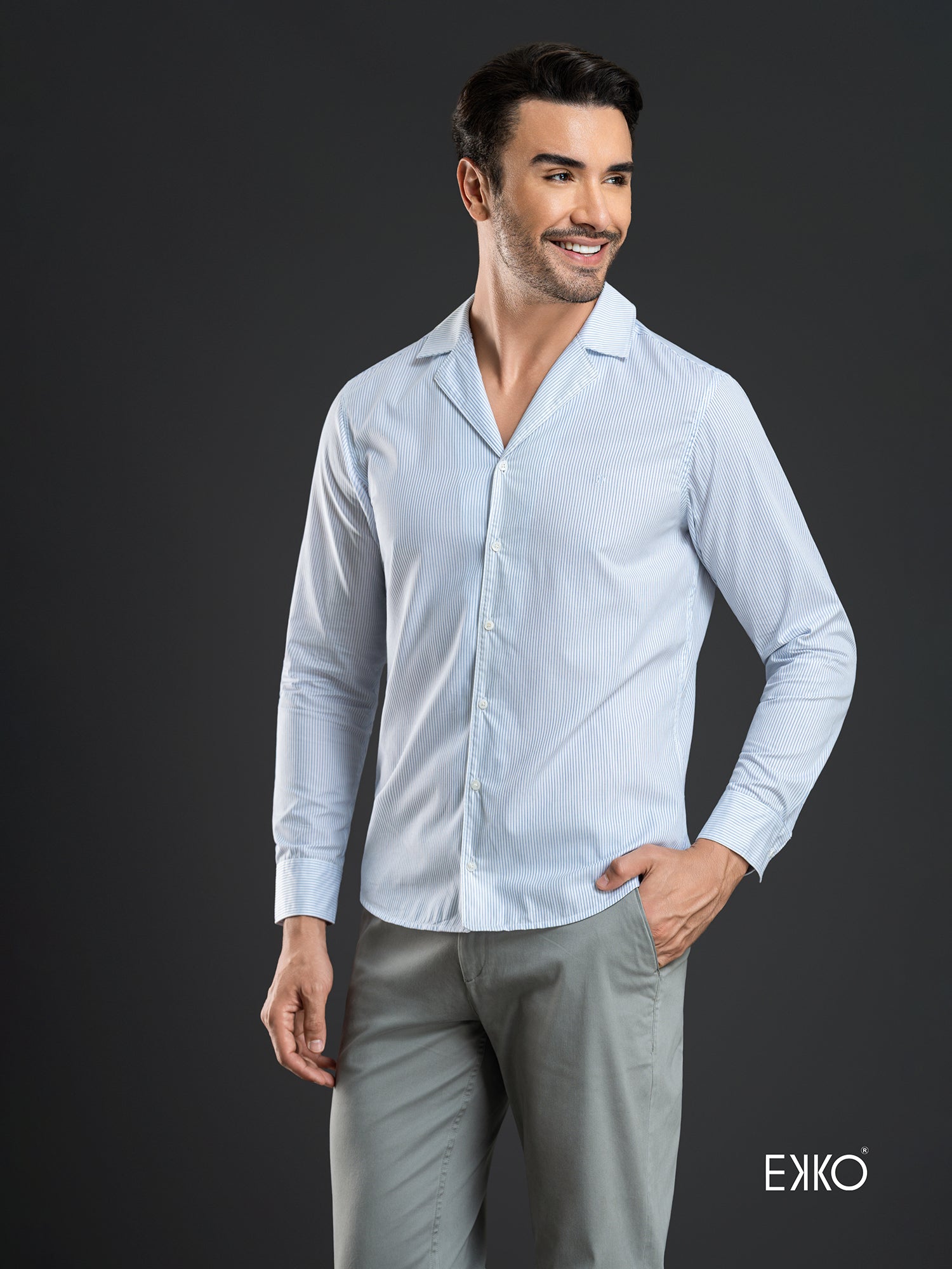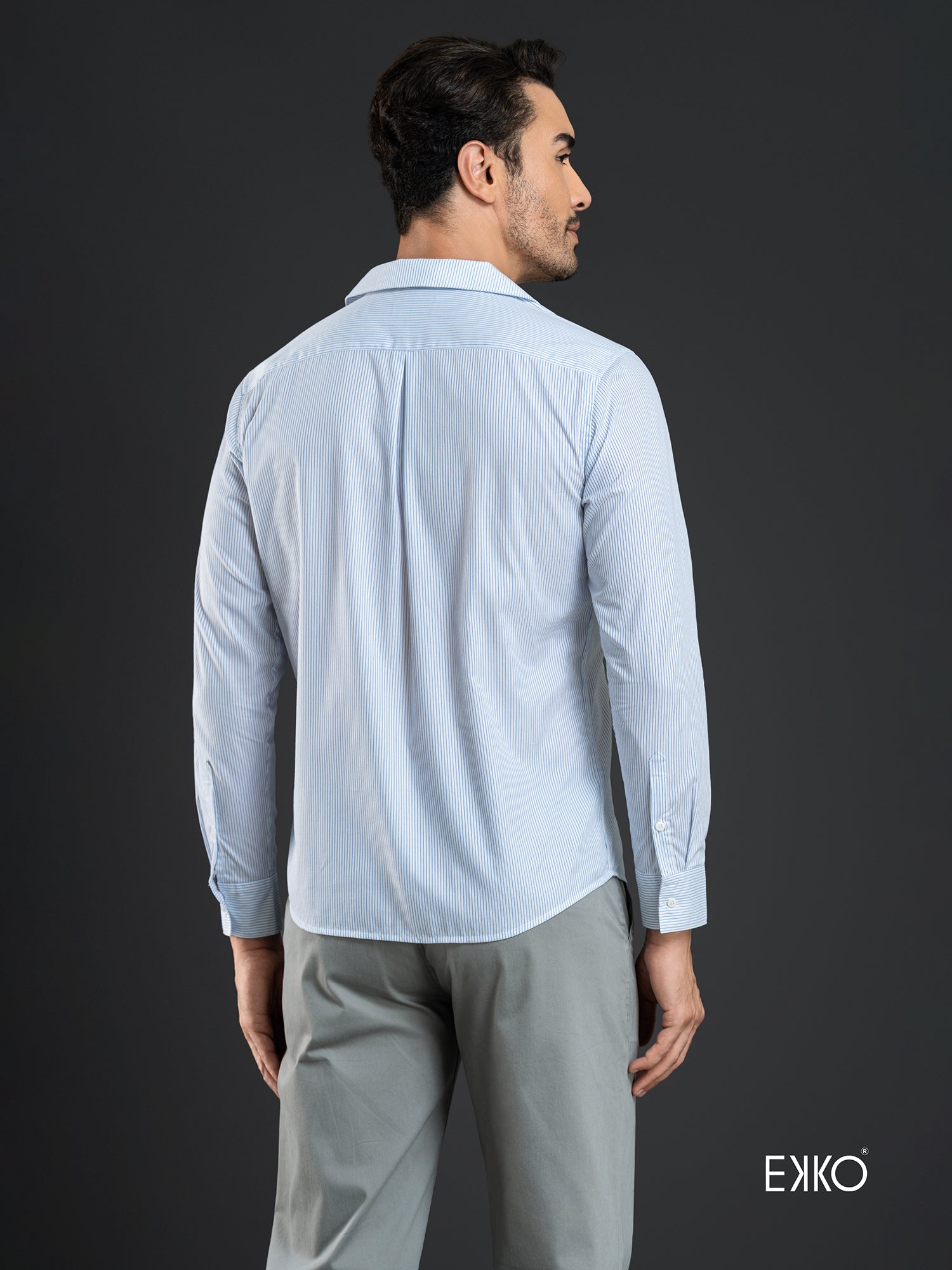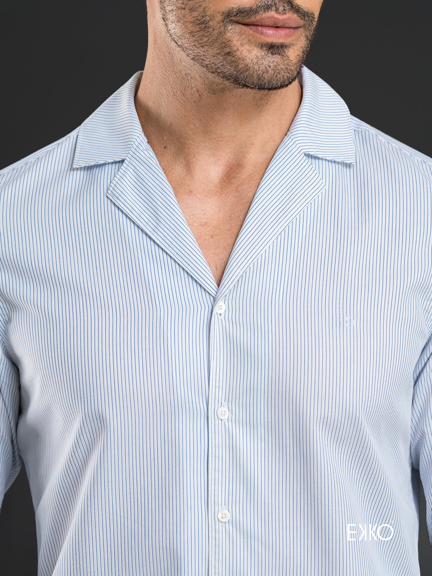 A 100% cotton long-sleeve shirt featuring a slim fit and lapel collar for a crisp, tailored look. Designed in white with subtle stripes, it combines classic refinement with modern appeal. The lightweight cotton fabric ensures breathability and comfort, making it perfect for both professional and smart-casual occasions.