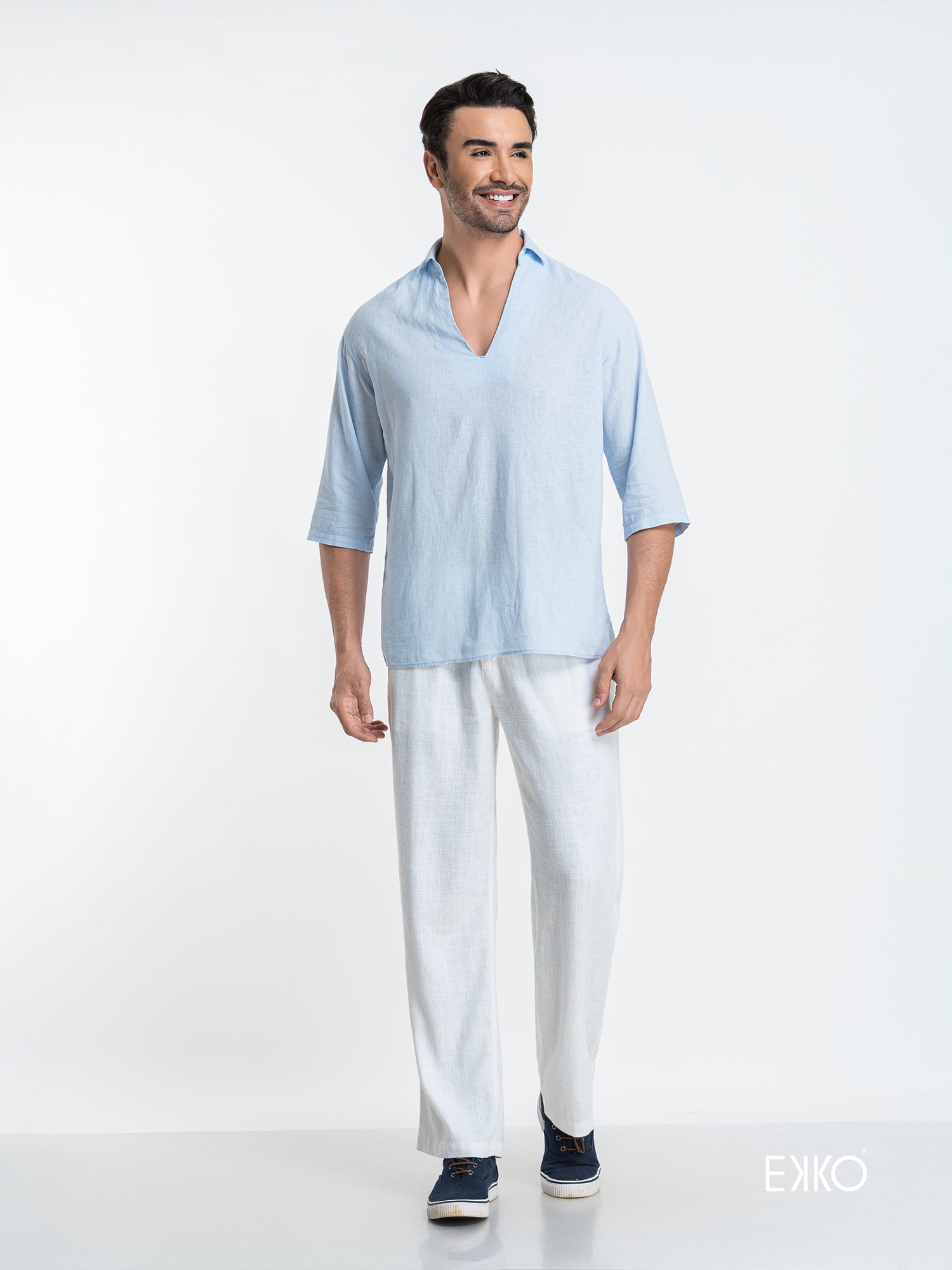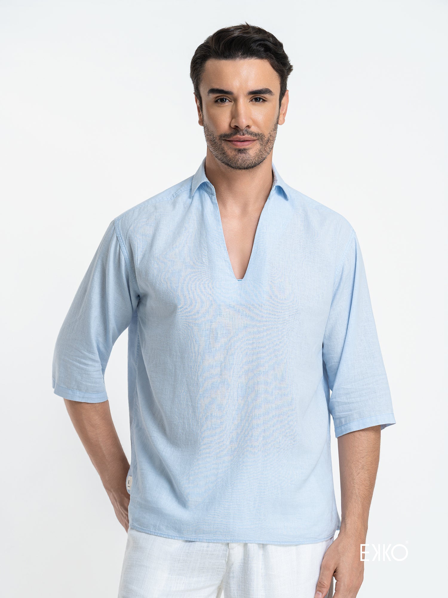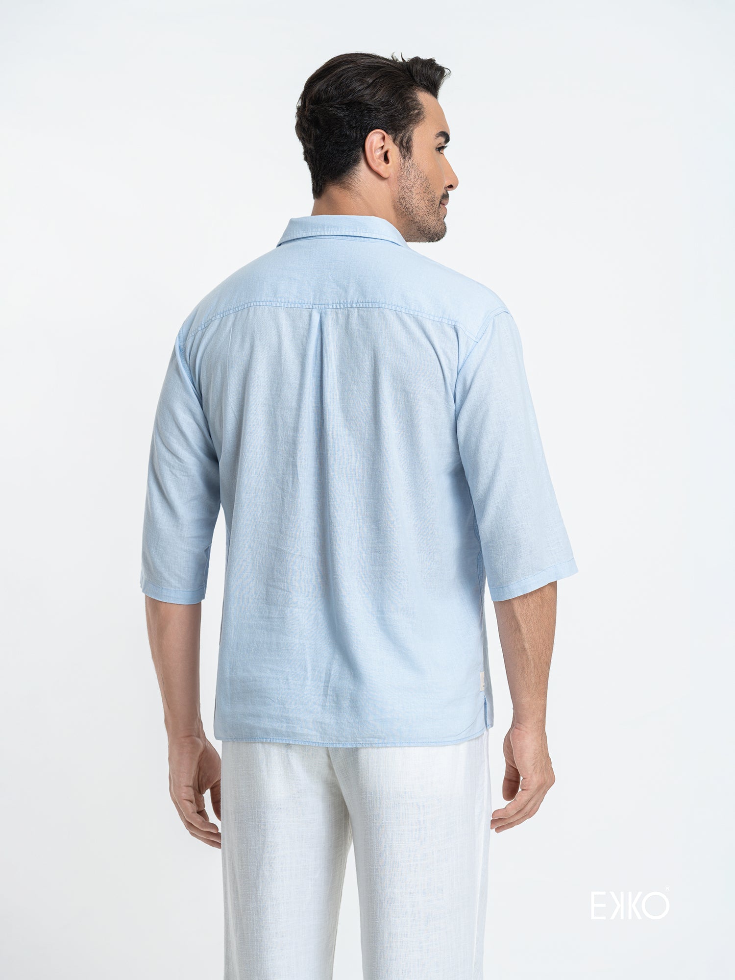 Embrace effortless elegance with this light blue oversized shirt, designed for a relaxed and contemporary fit. The dropped lapel collar creates a soft, inviting neckline that pairs beautifully with the three-quarter sleeves, offering both comfort and style for warmer days. A subtle contrast fabric on the inner collar band adds a unique touch of sophistication and visual interest, elevating this casual piece into a refined wardrobe staple.