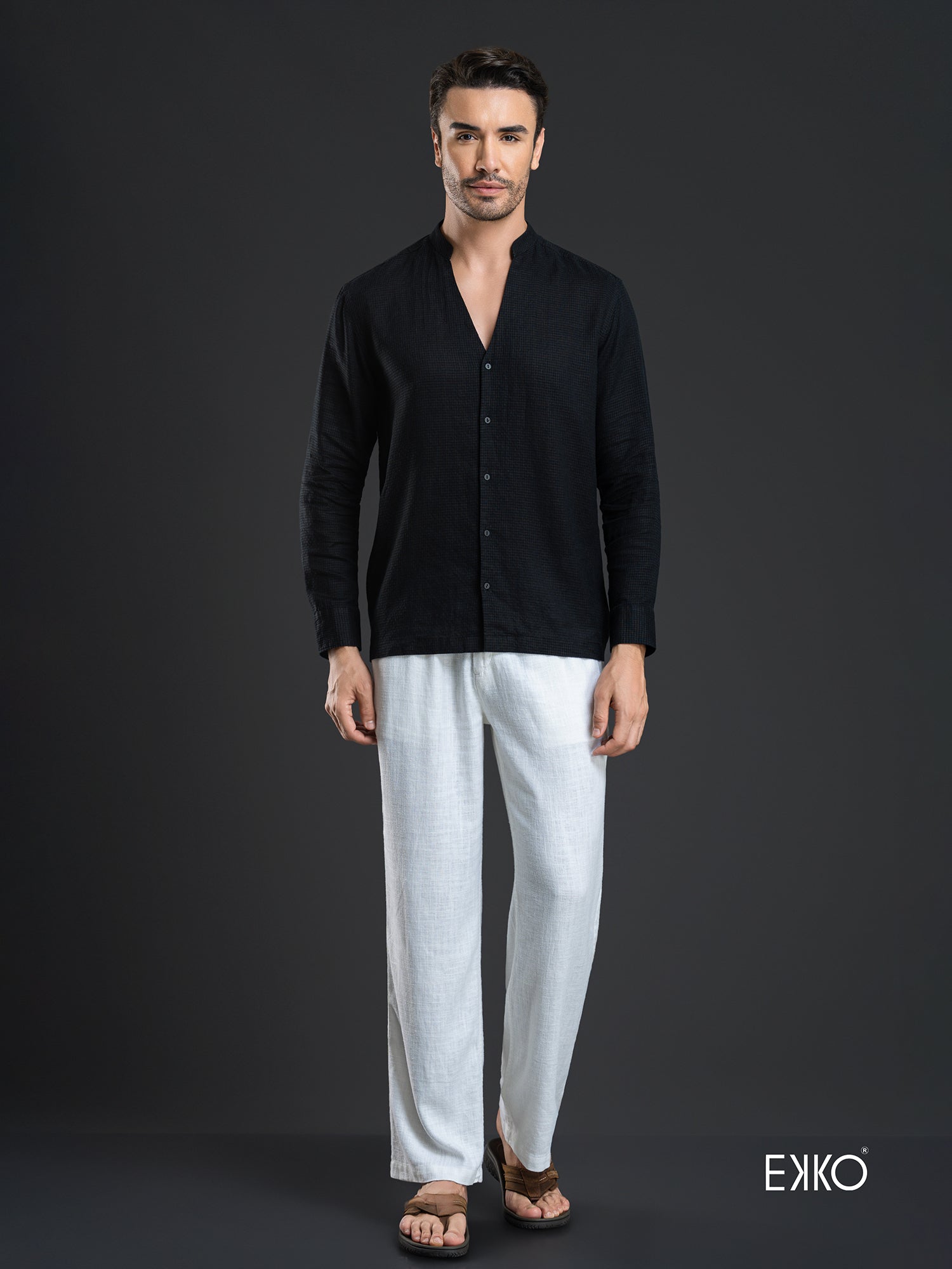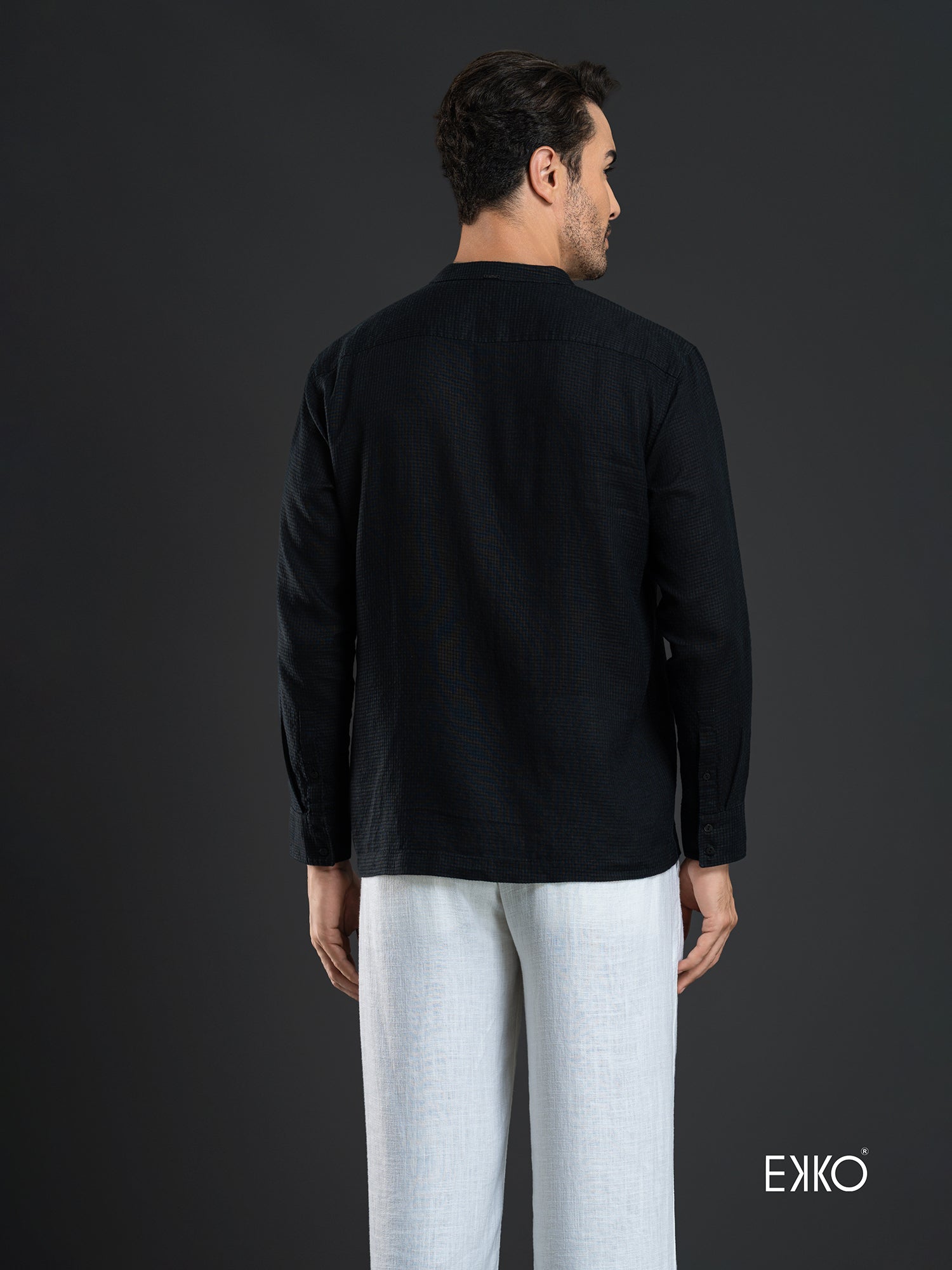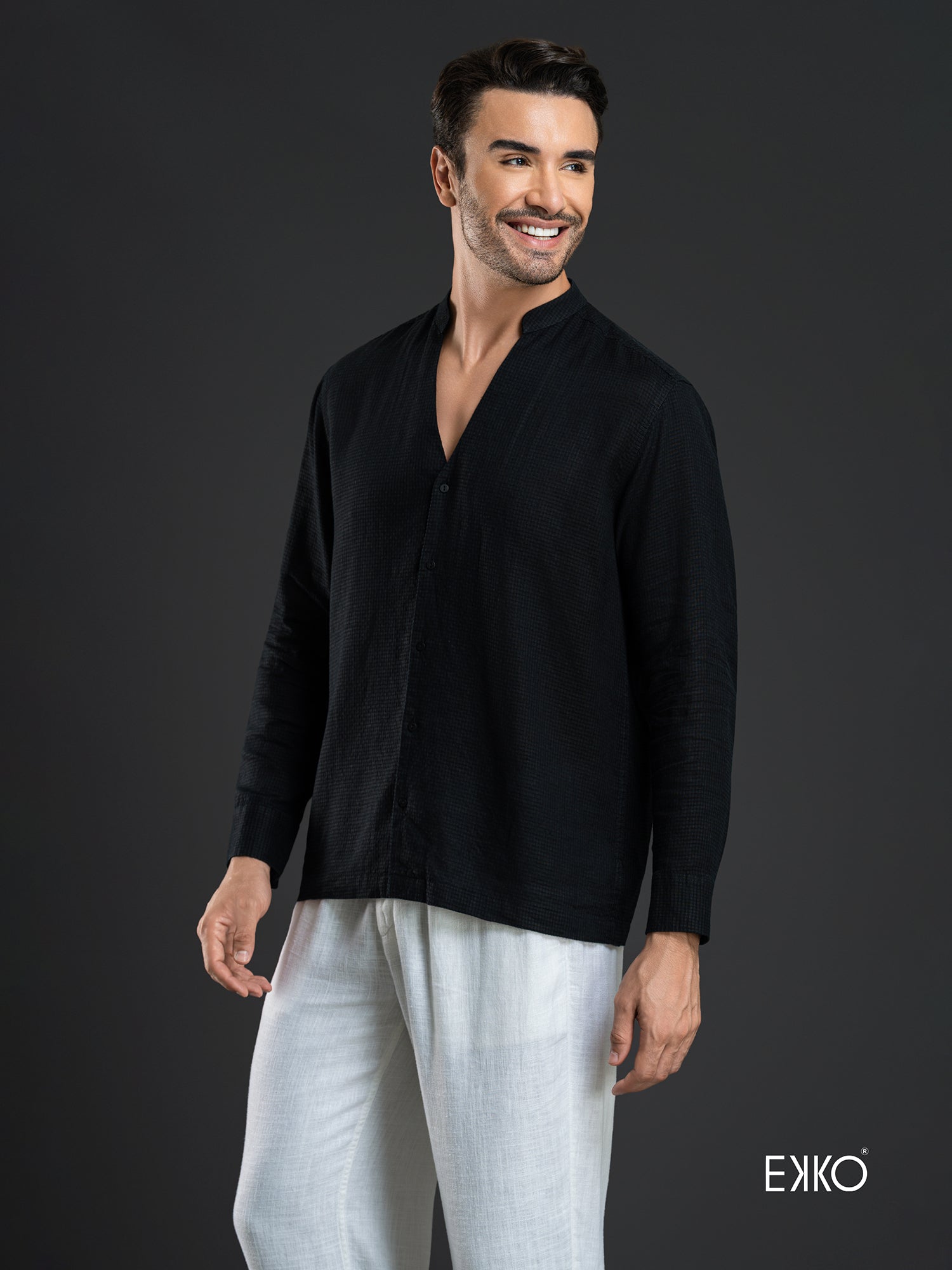 A linen-viscose long-sleeve shirt in black, designed with a V-neck and Mandarin collar for a clean, modern aesthetic. The comfort fit offers relaxed ease while maintaining a polished silhouette. Soft, breathable, and naturally draping, it’s an effortlessly versatile piece ideal for both casual and refined looks.