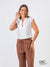 A white relaxed-fit cropped top with a lapel collar, V-neckline, and cap sleeves. This easy-breezy design is the perfect resort wear, offering effortless style and comfort for warm-weather days.