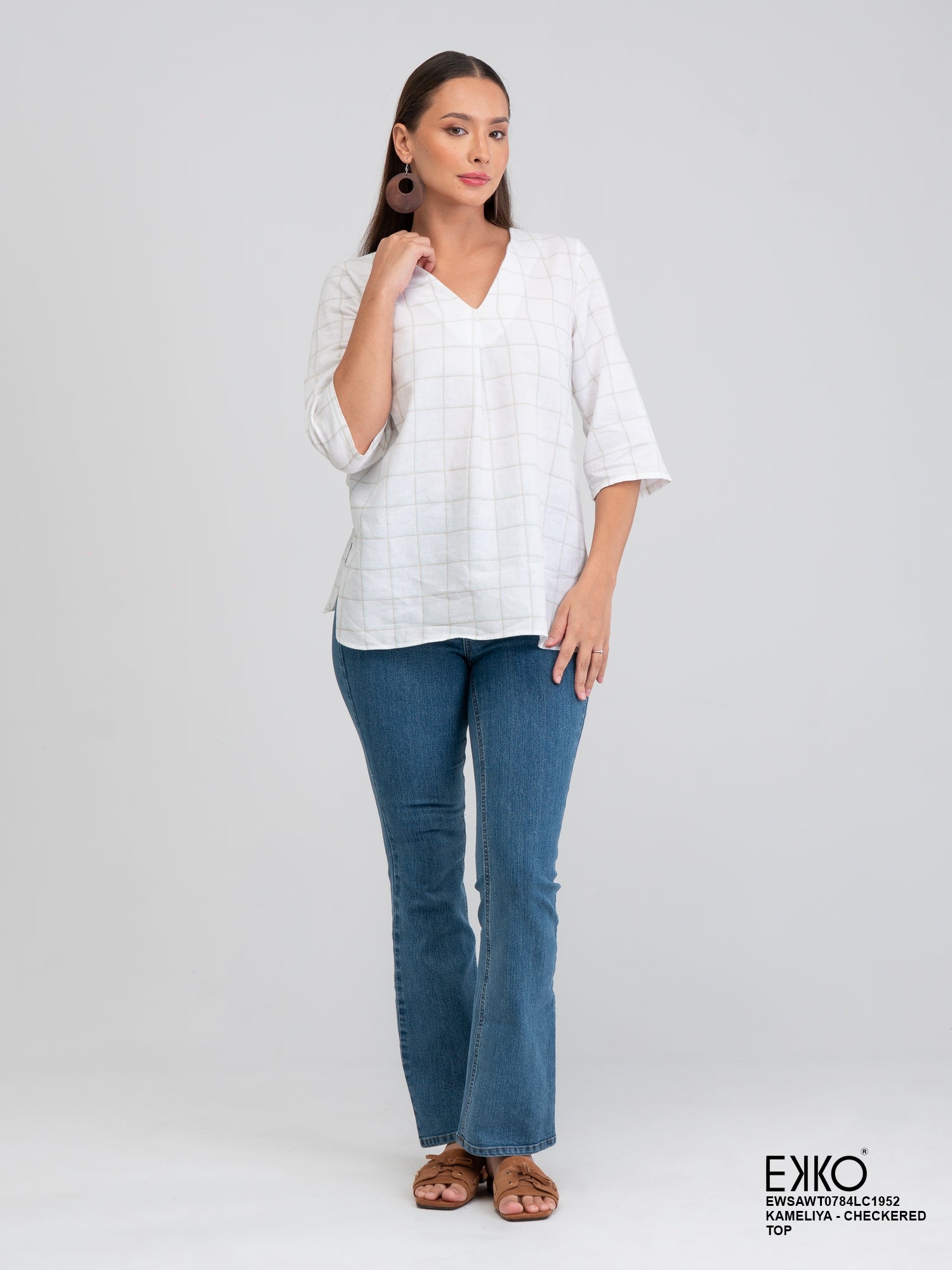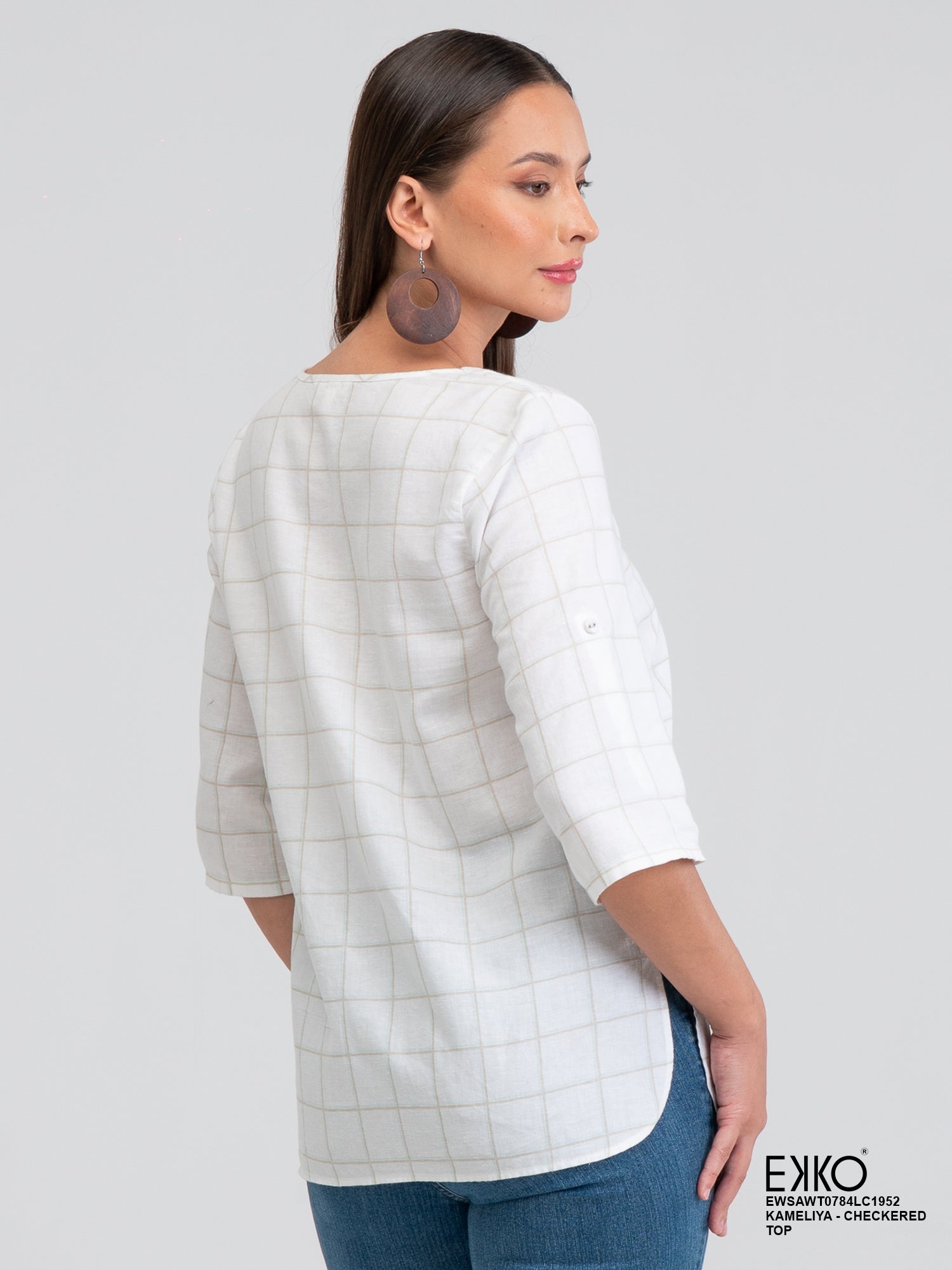 Effortlessly versatile, this check-pattern shirt features a flattering V-neckline and chic sleeve tabs for a relaxed yet polished look. Perfect for casual days or smart workwear, it’s your go-to piece for style that works anywhere.
