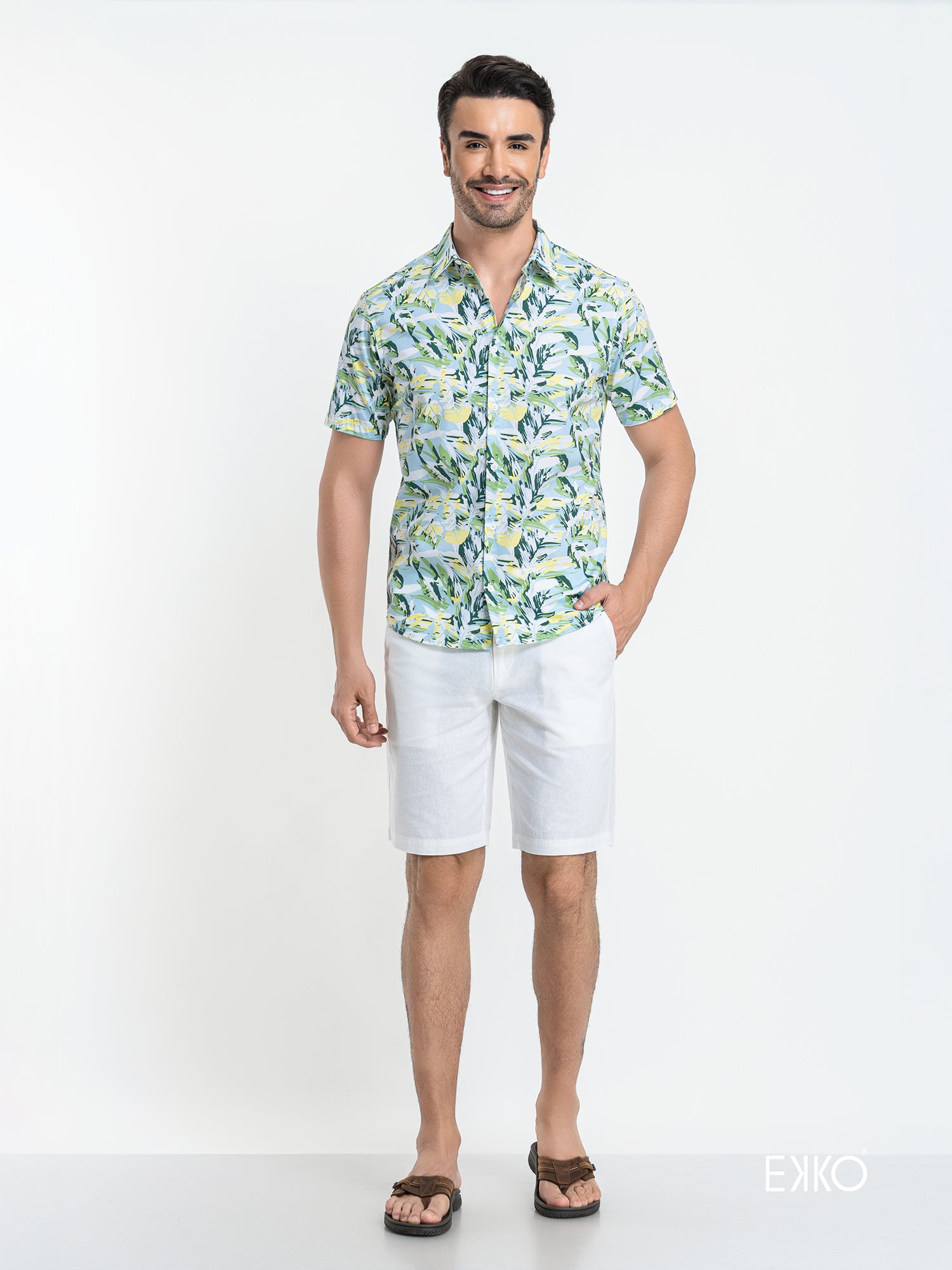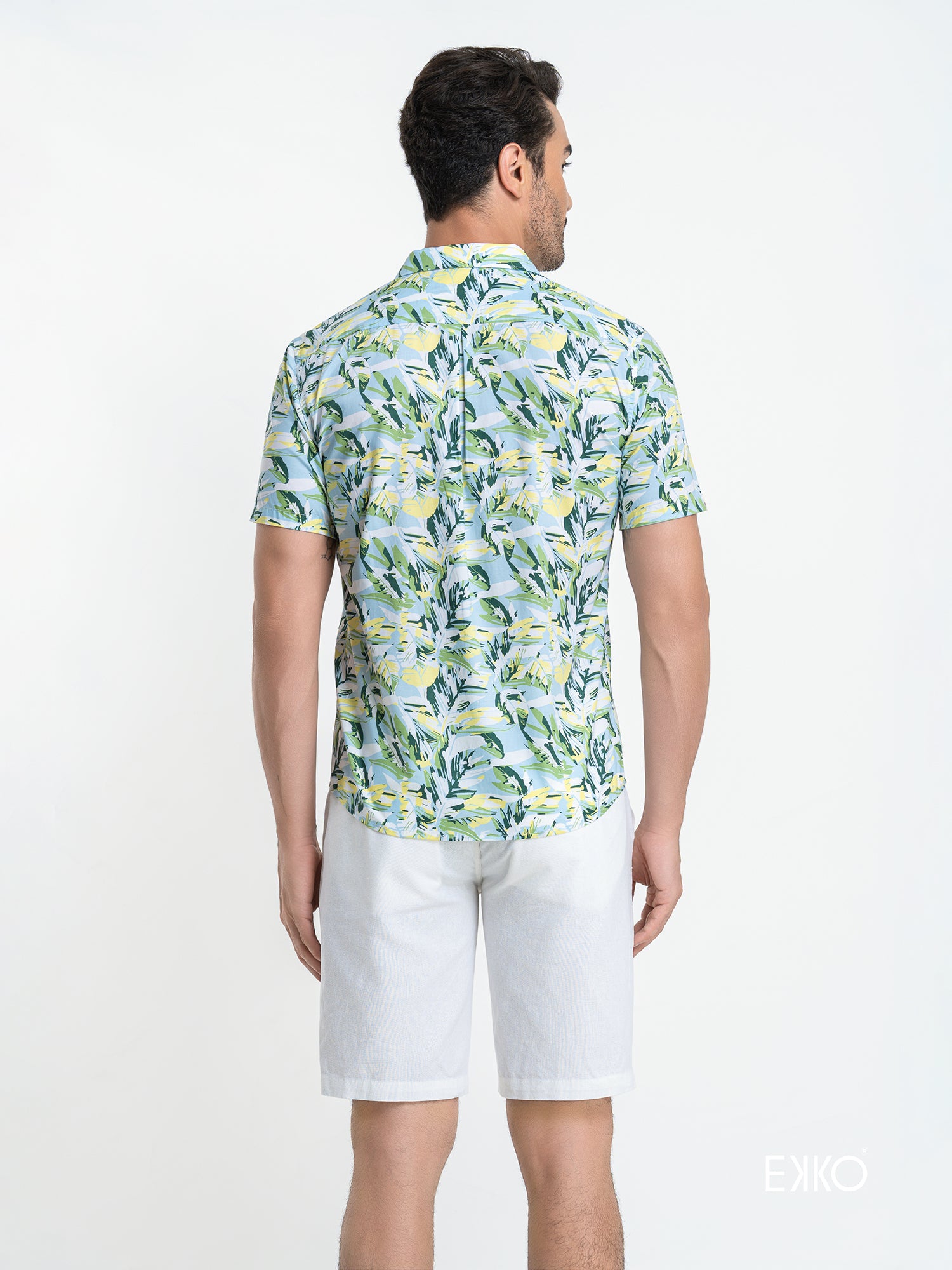 A slim fit short sleeve shirt crafted from a cotton–elastane blend for added stretch and comfort. Designed with a classic standard collar and a clean button-down front, this printed style offers a modern, tailored look while ensuring ease of movement for all-day wear.