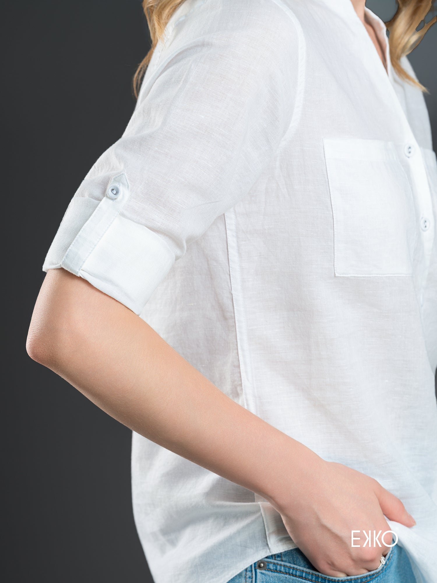 LOOSE FITTED DEEP NECK ROLL-UP SLEEVE SHIRT