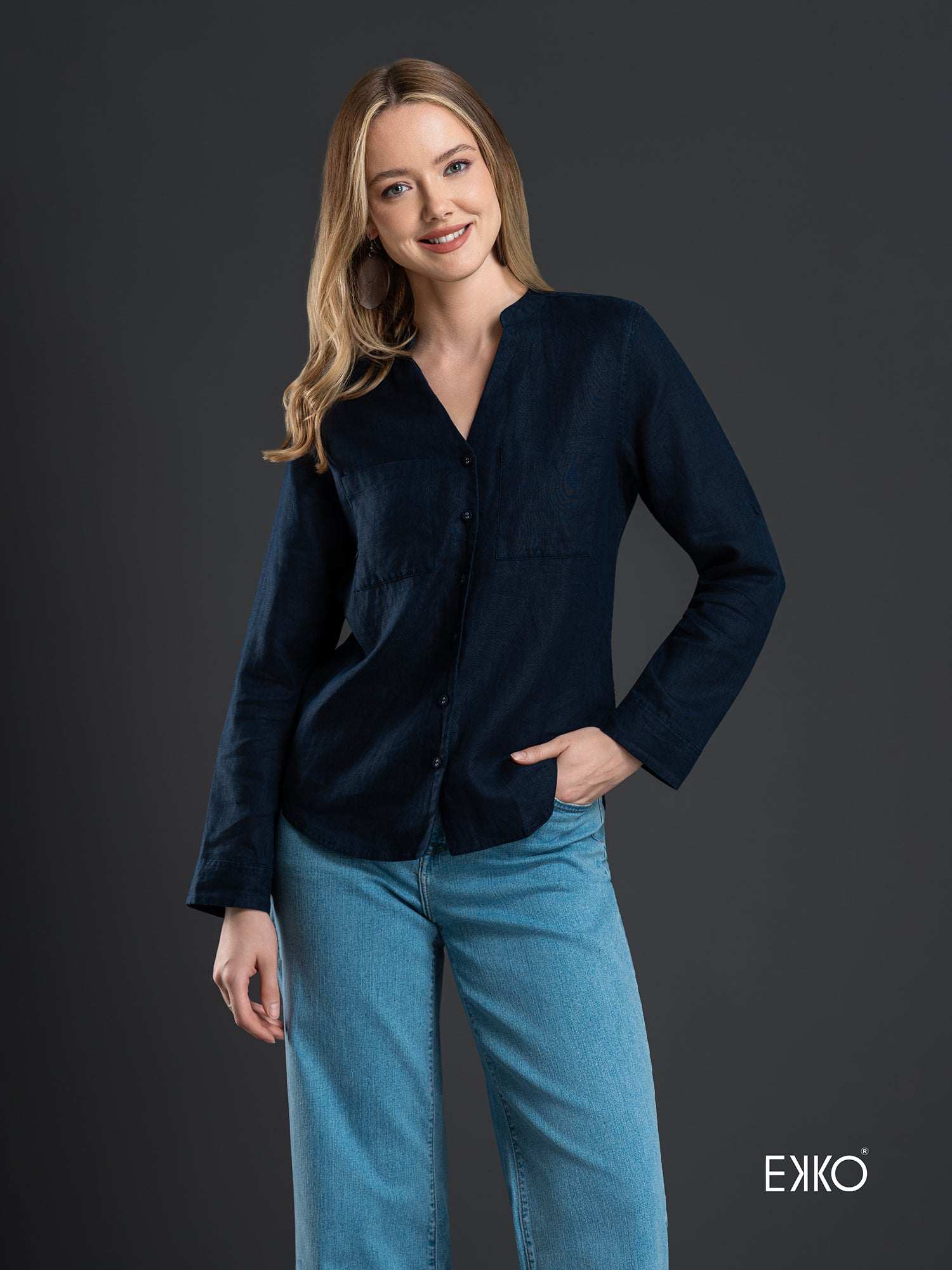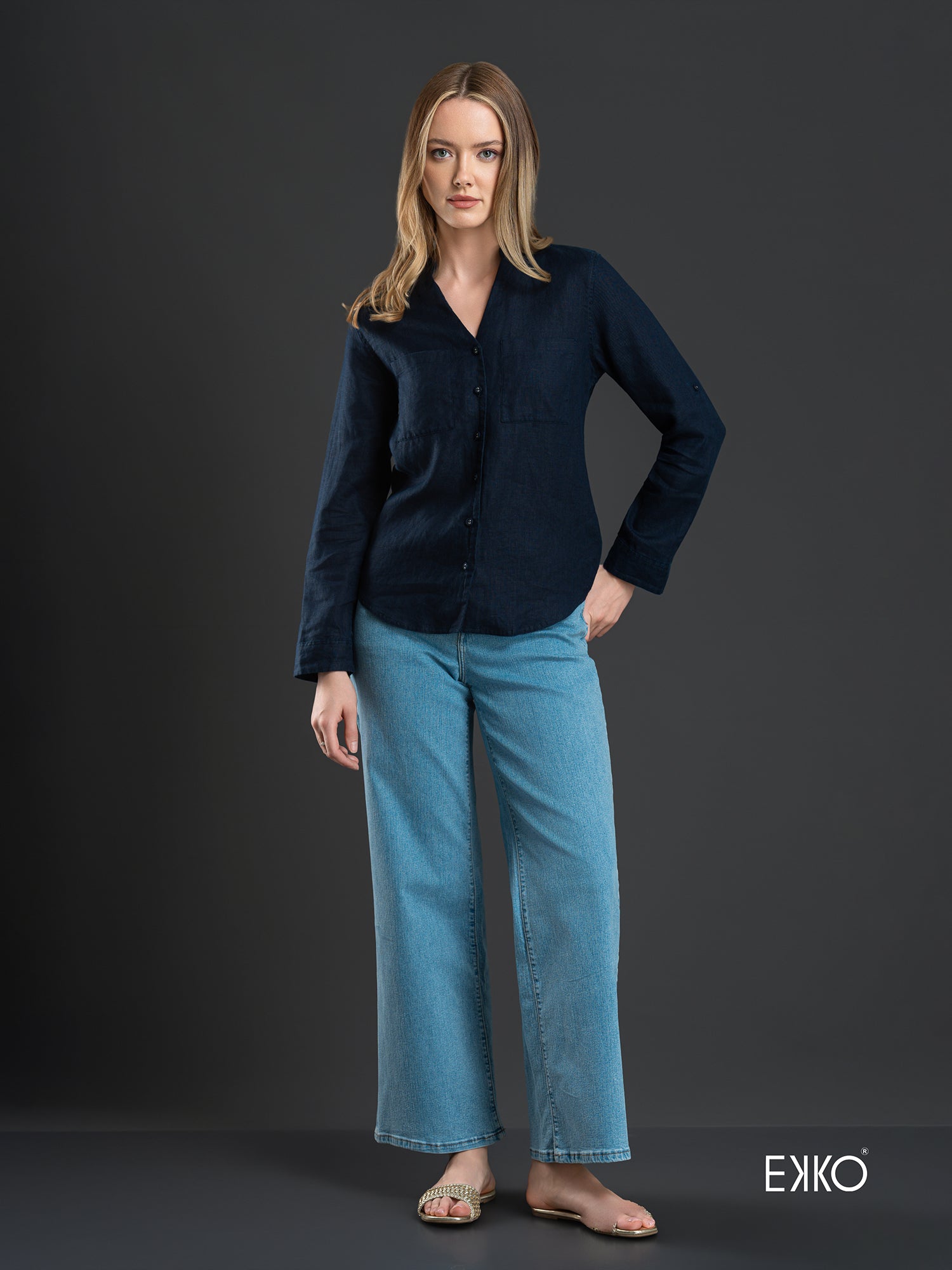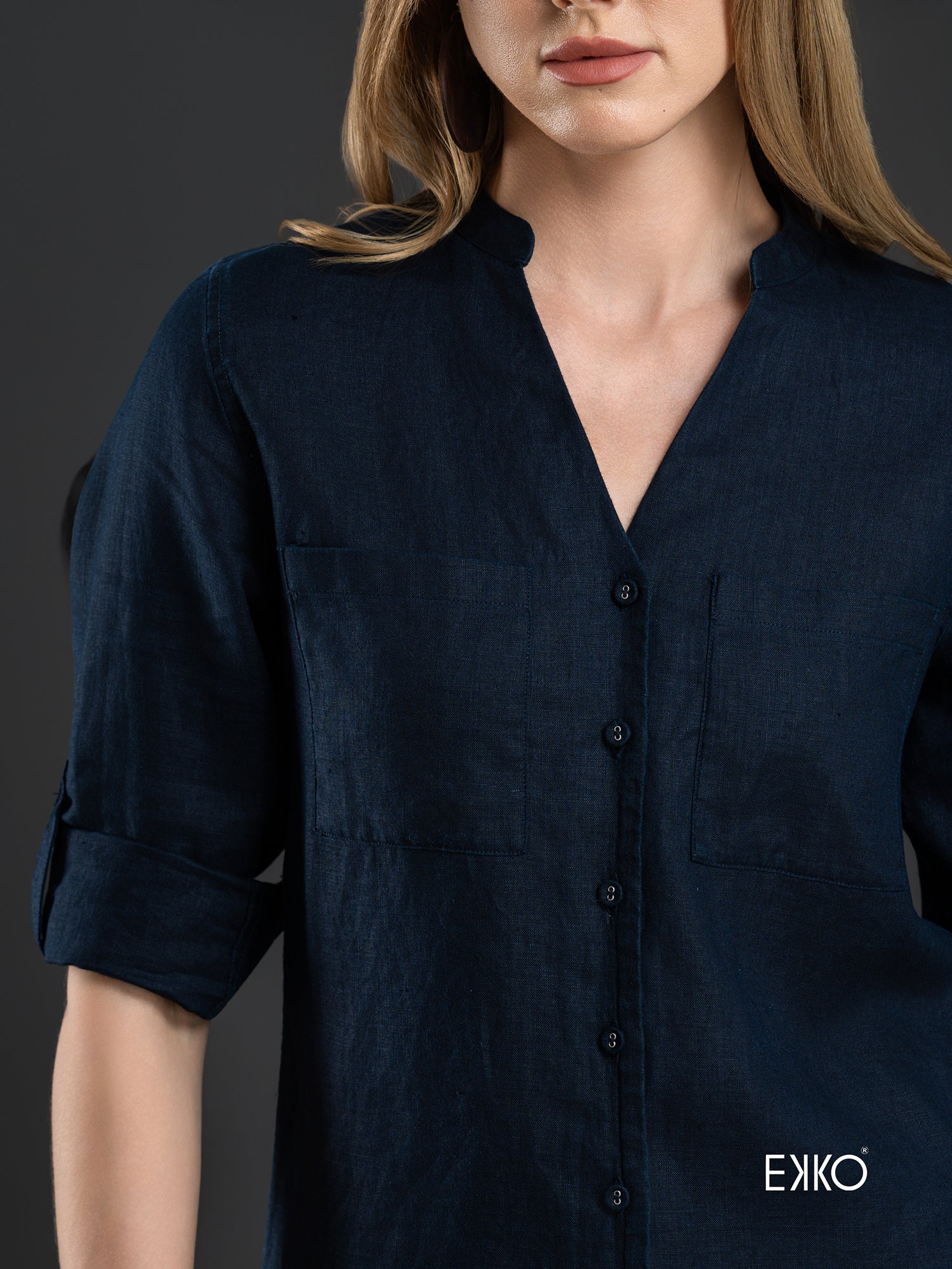 Relaxed yet bold, this loose shirt features a deep neckline and roll-up sleeves for a laid-back, modern edge. Effortlessly versatile, it can be styled layered or tucked for an easy, confident look.
