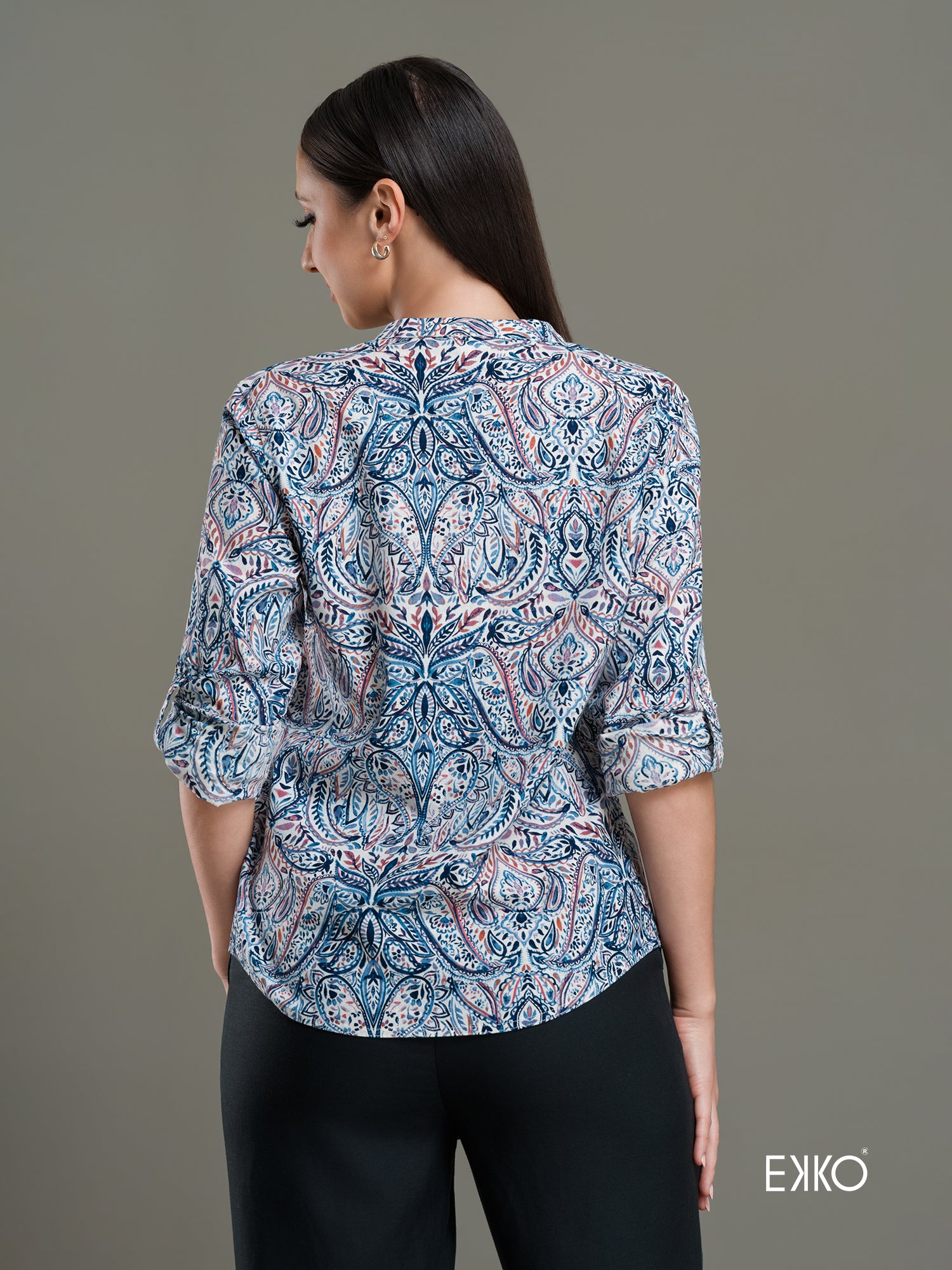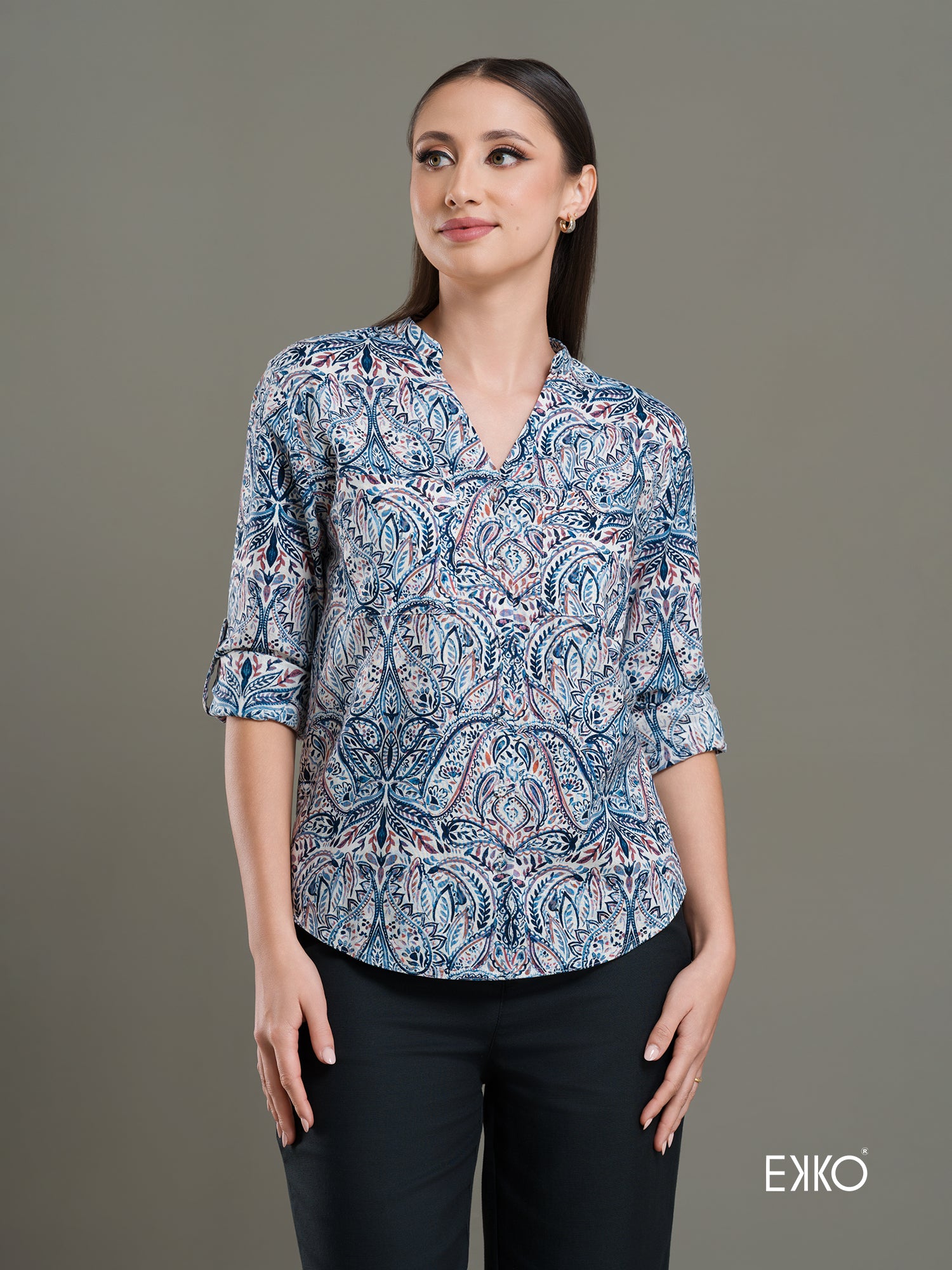 LOOSE FITTED DEEP NECK ROLL-UP SLEEVE SHIRT