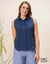 A sleeveless navy blue top with a standard collar, button-down front, and a relaxed fit. Perfect for a smart casual look, offering effortless style and comfort.