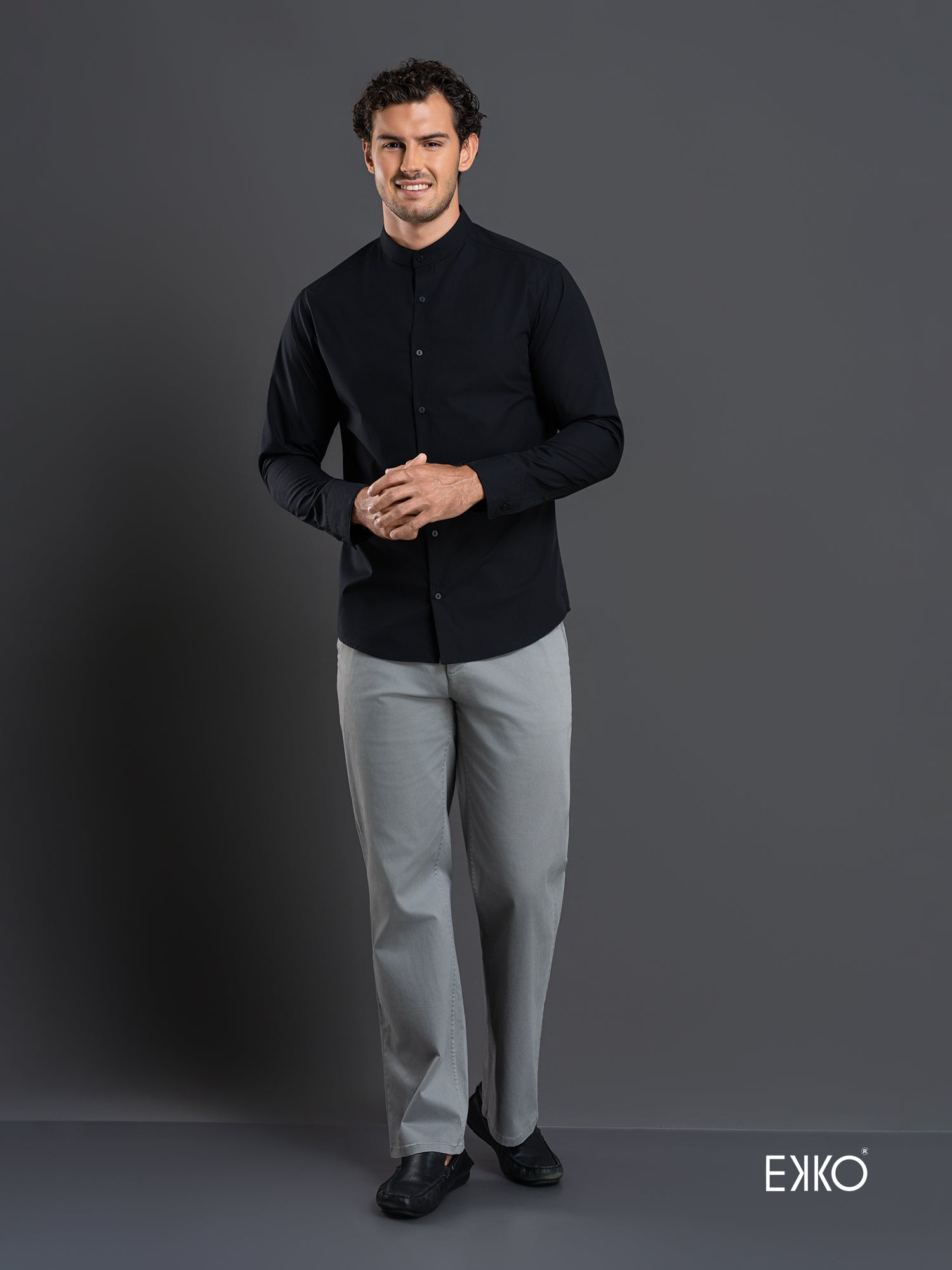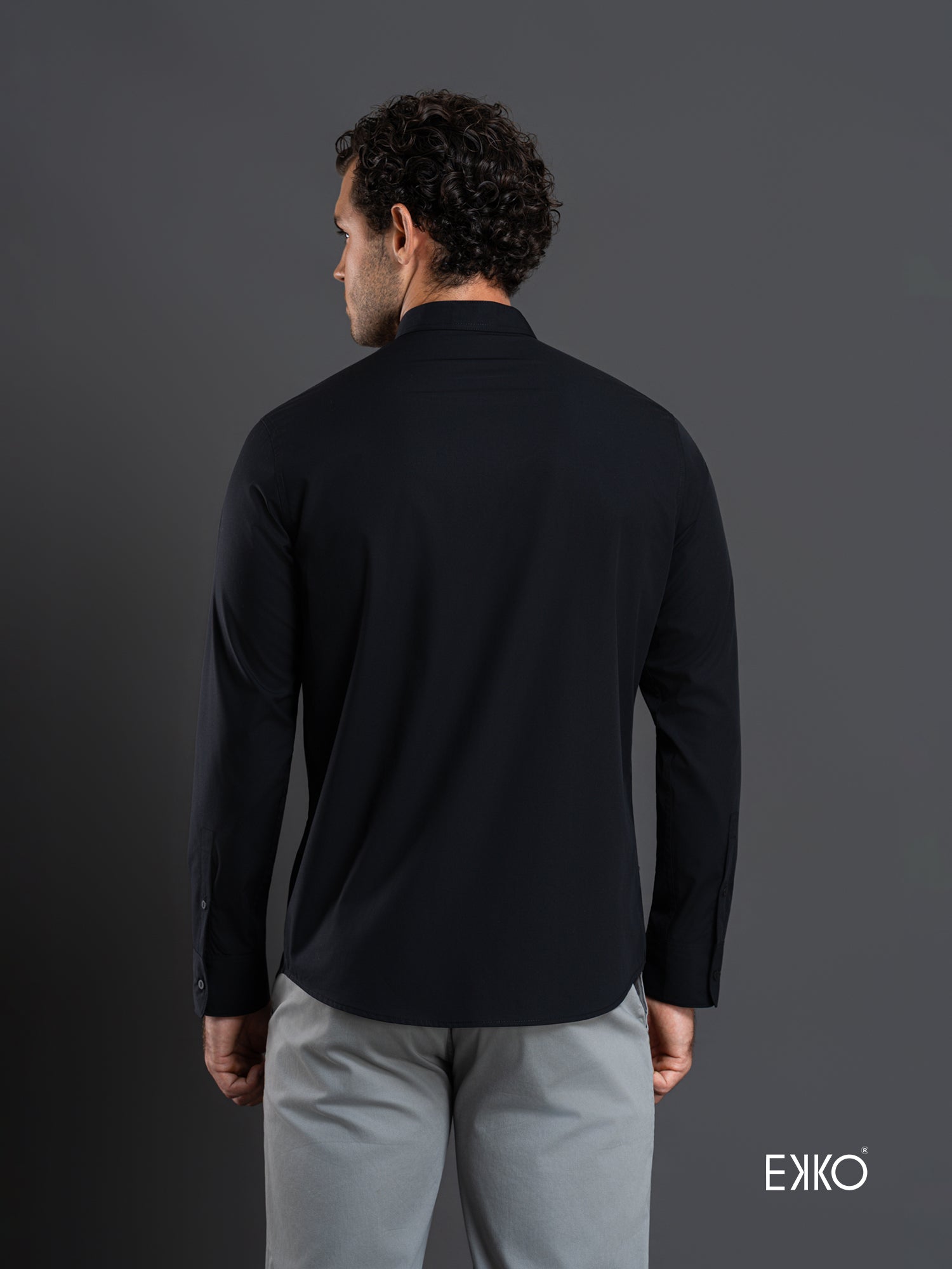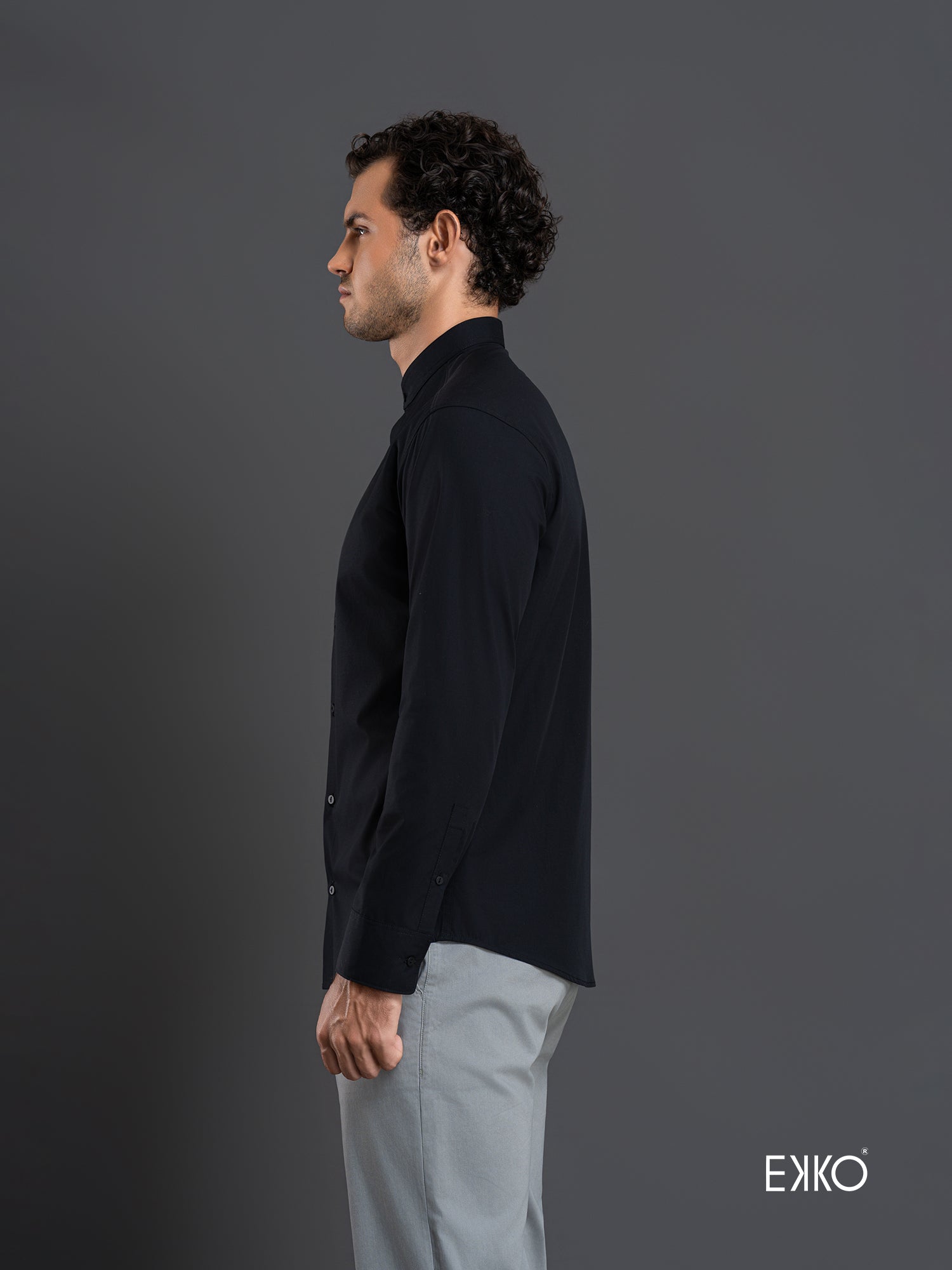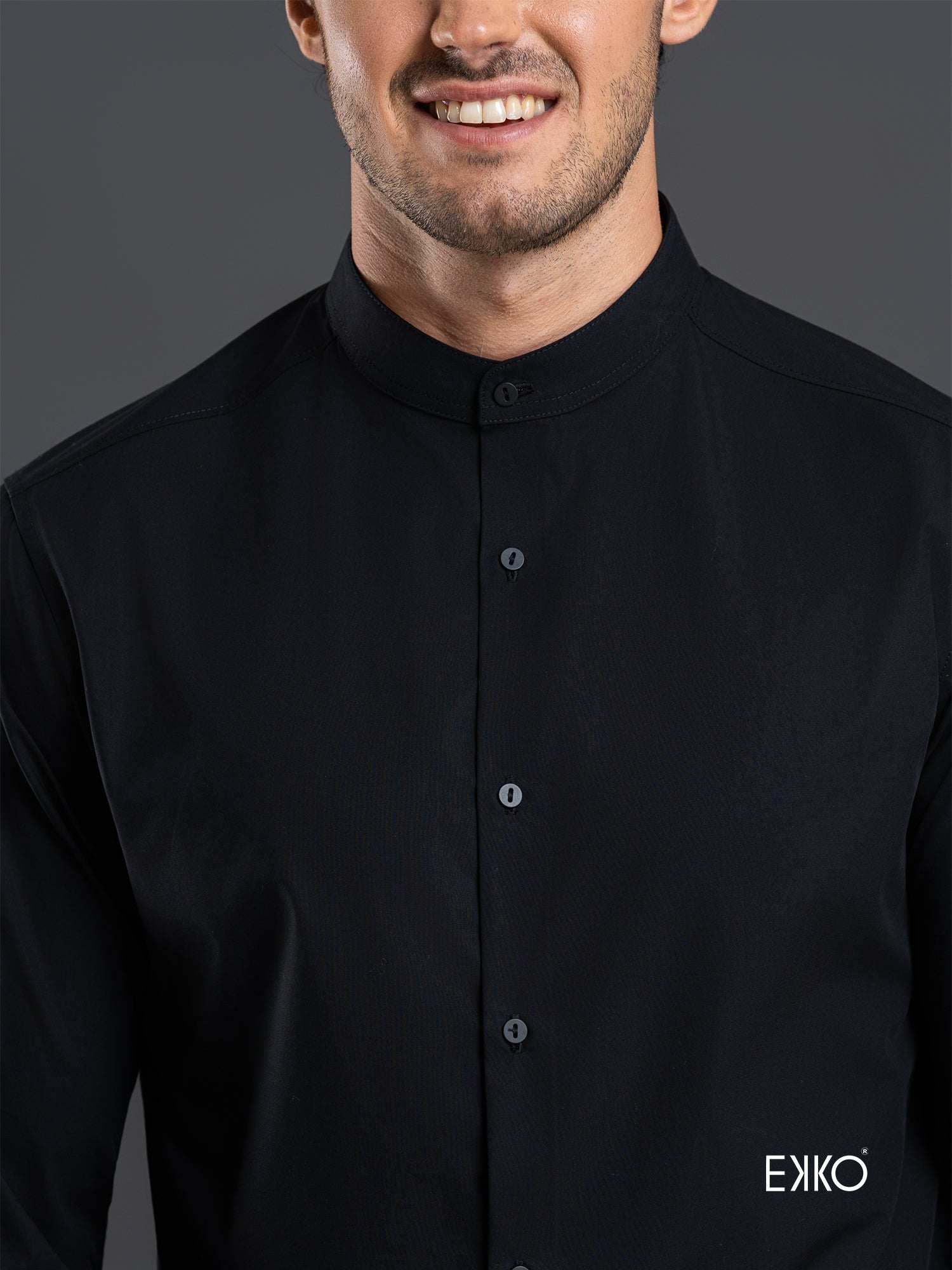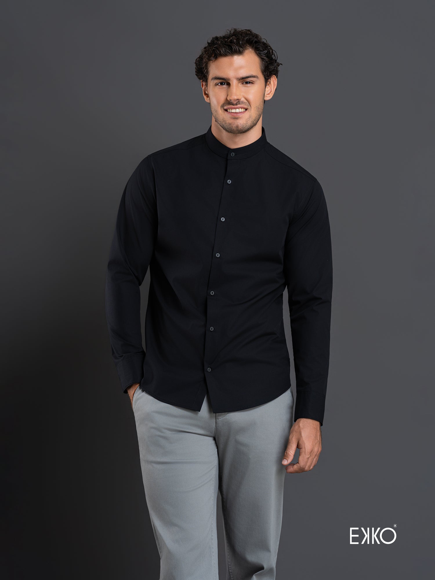 Black long-sleeve slim-fit shirt crafted from a cotton–elastane blend, featuring a mandarin collar for a modern, streamlined look. Designed to provide subtle stretch, comfort, and a sharp, contemporary silhouette.