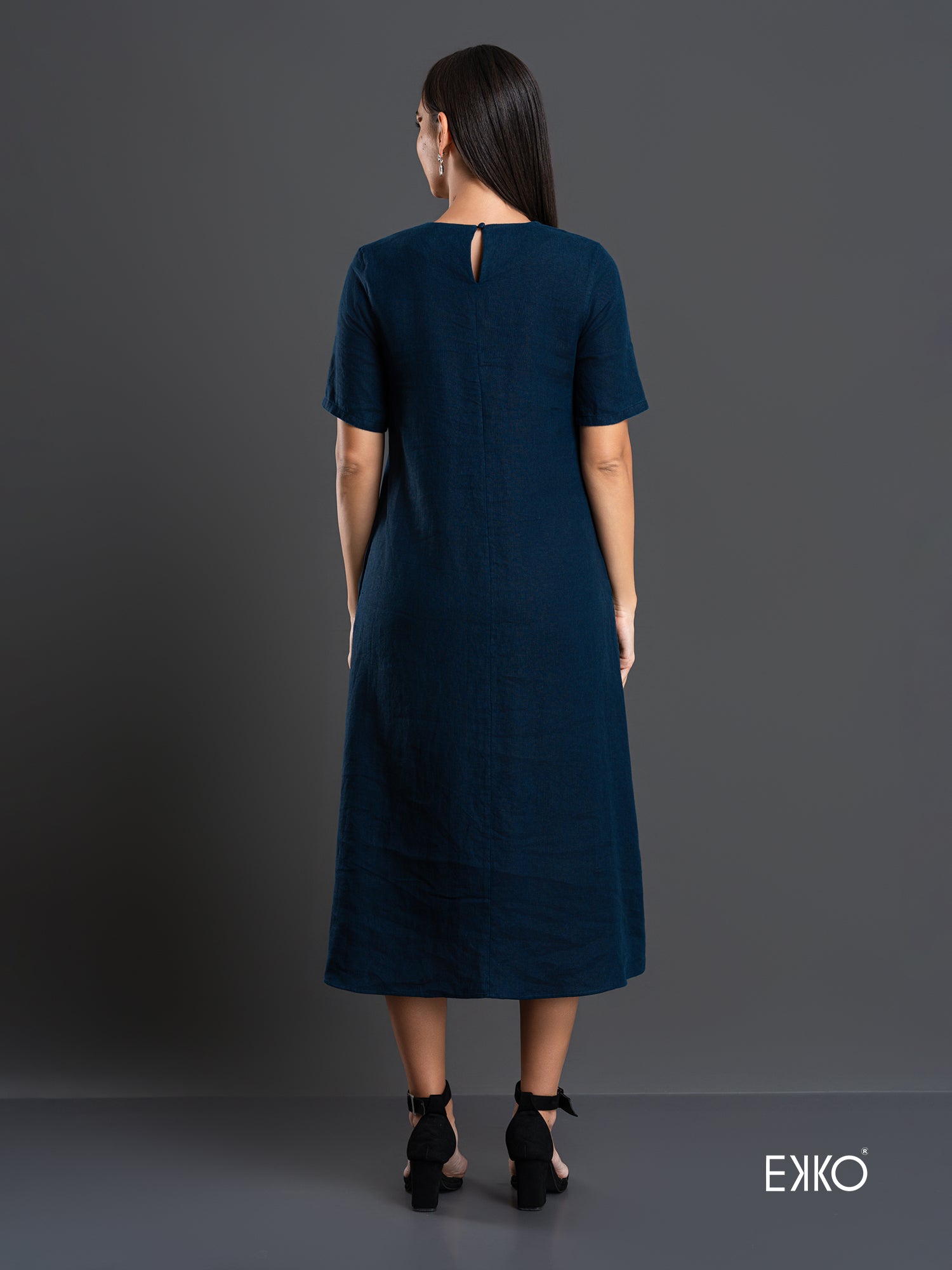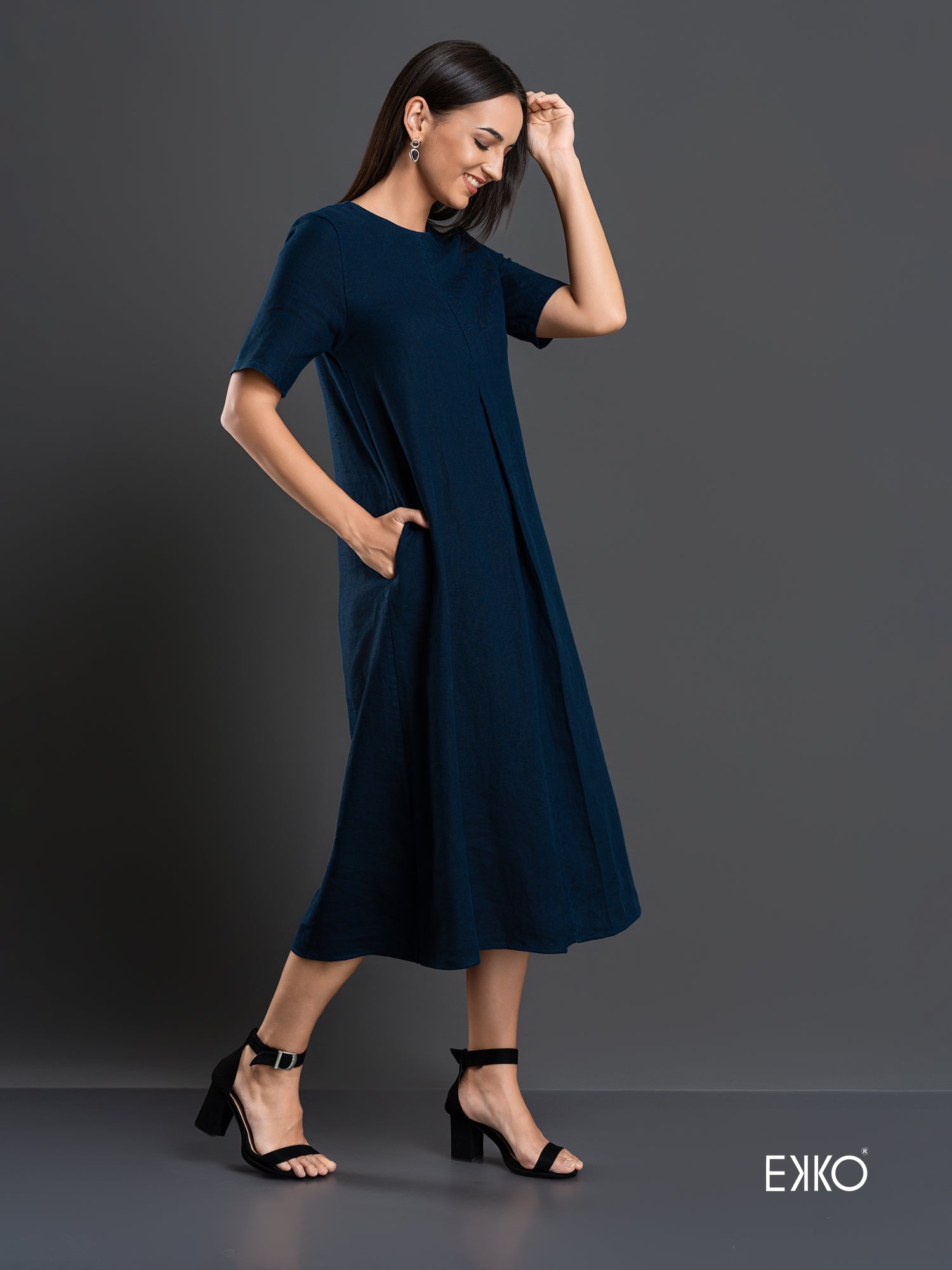 A loose-fitted long dress with side seam pockets that is both chic and comfortable. The inverted pleat on the front gives the illusion of a taller and slimmer appearance to the wearer.