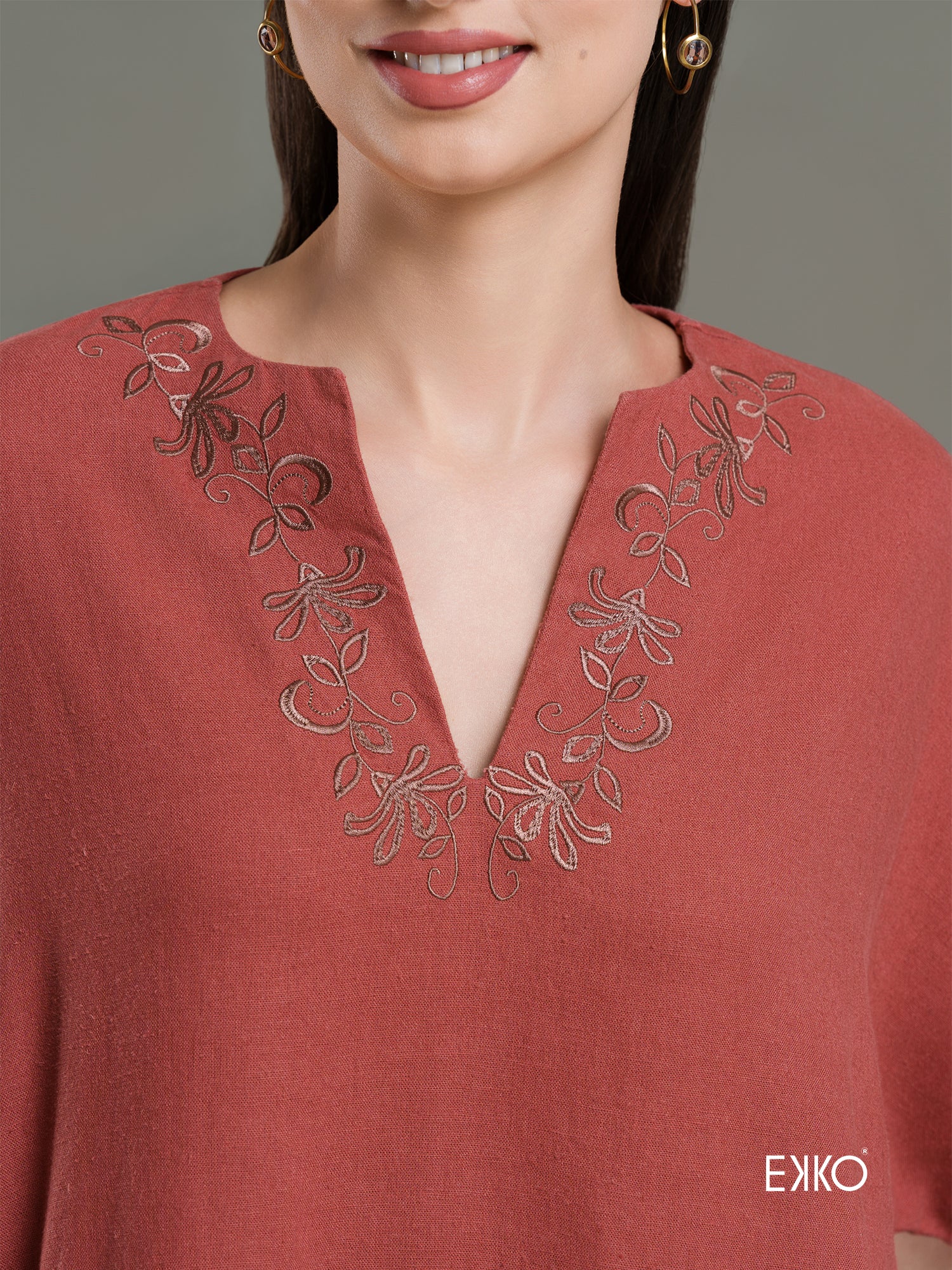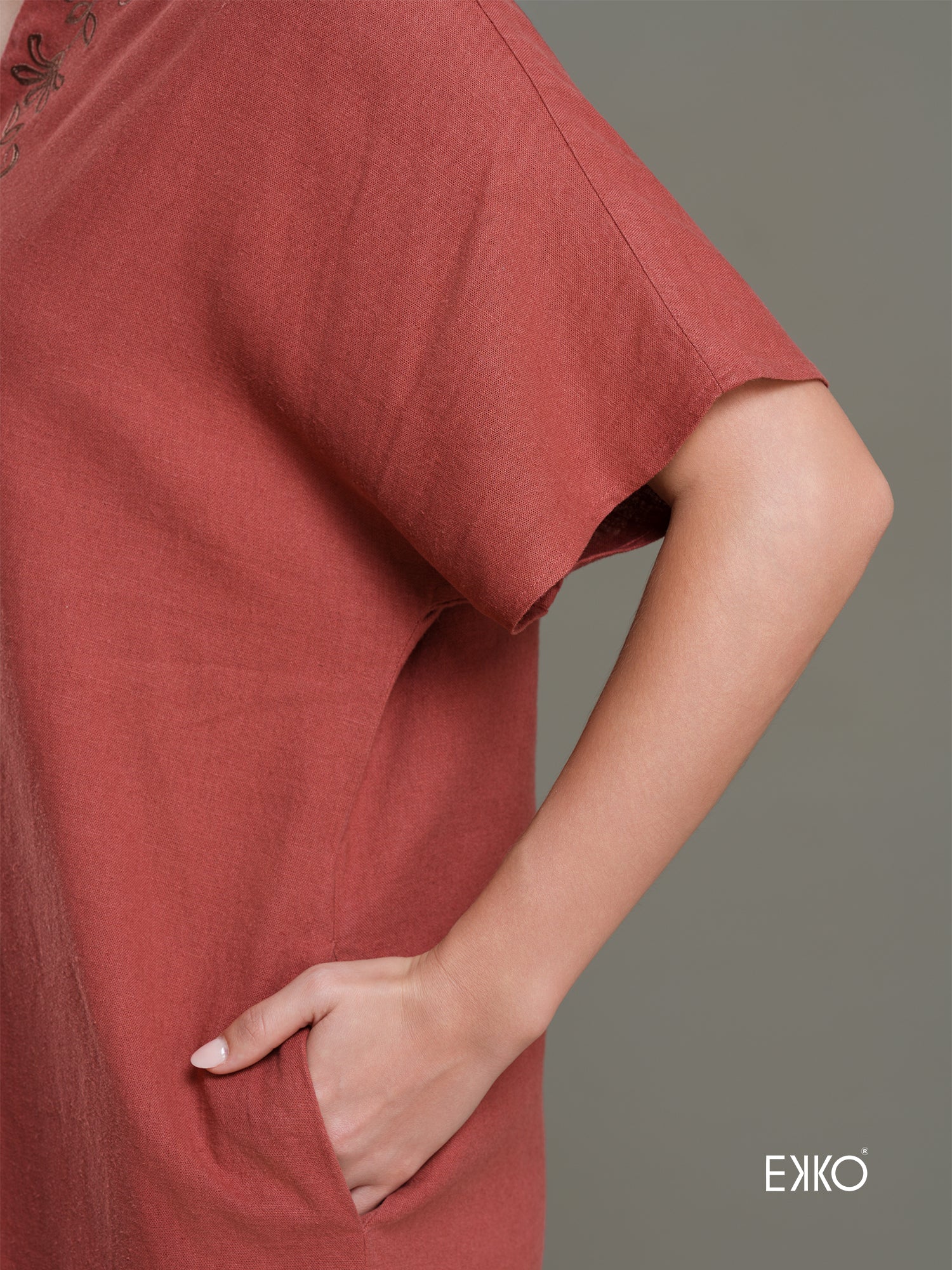 A relaxed mini dress featuring delicate embroidery accents that add texture and visual interest. Its loose silhouette ensures comfort while maintaining a stylish, effortless look, perfect for casual or dressy occasions.