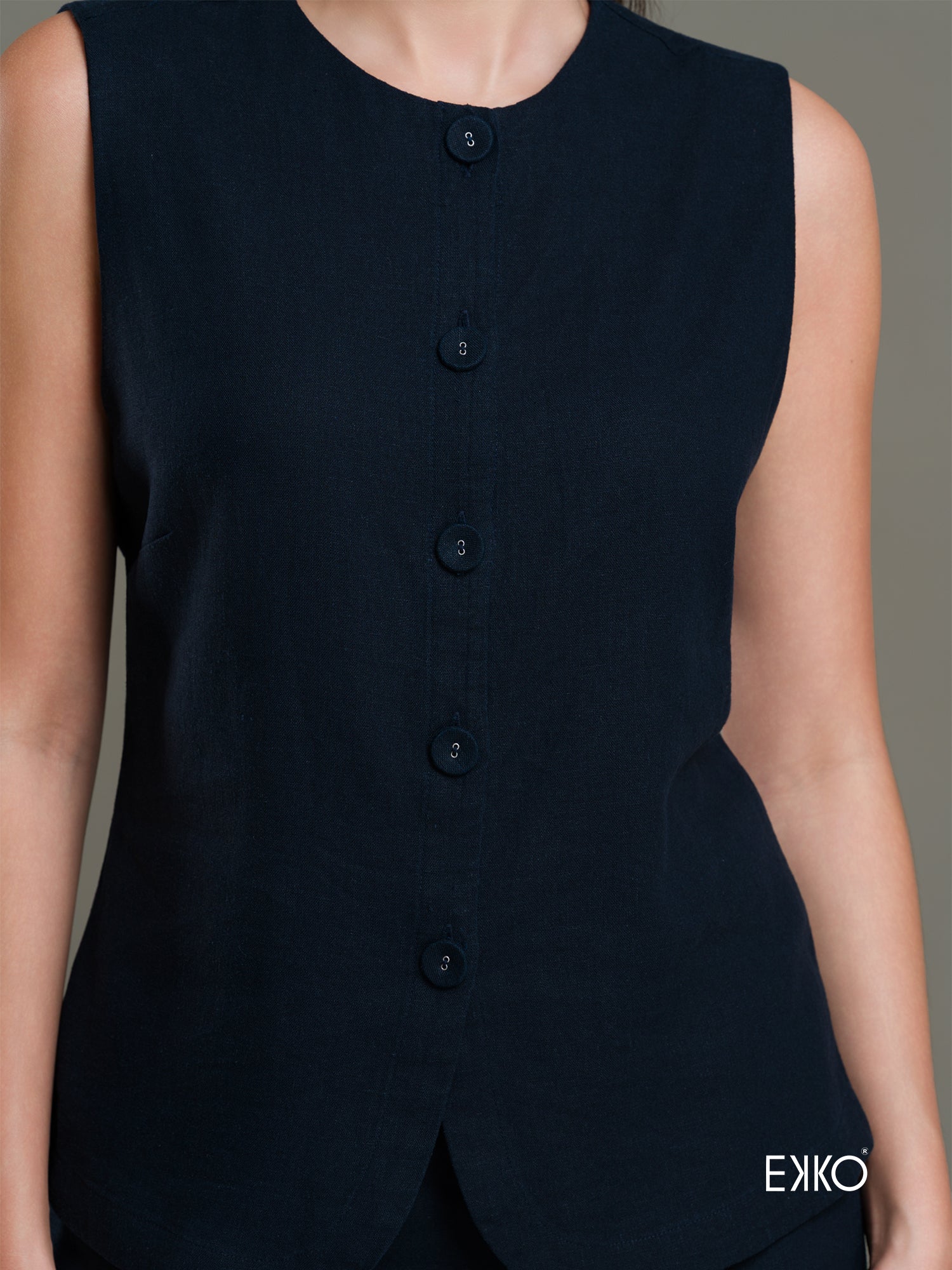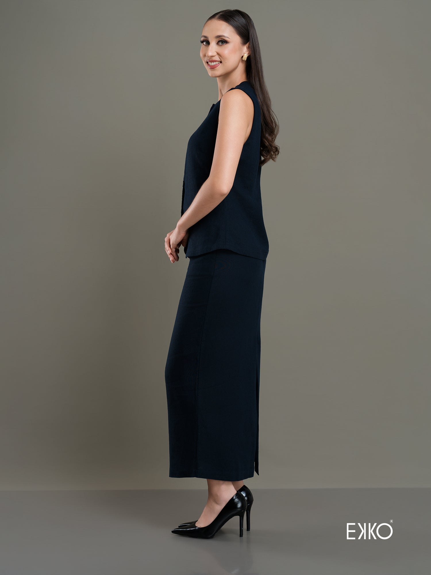 A structured waistcoat with cap sleeves paired with a sleek, high-waisted maxi skirt offering a modern twist on classic tailoring while creating a flattering, elongated silhouette.