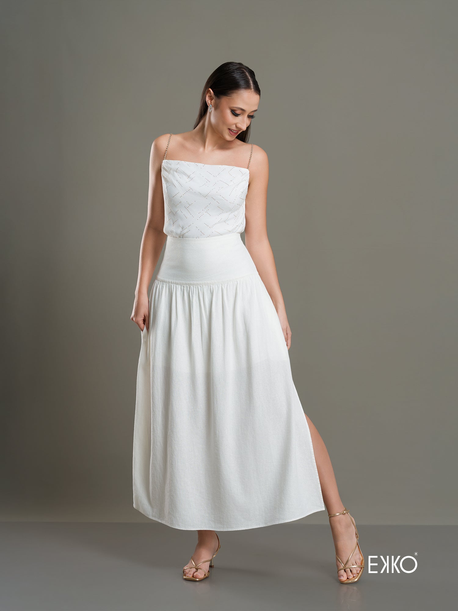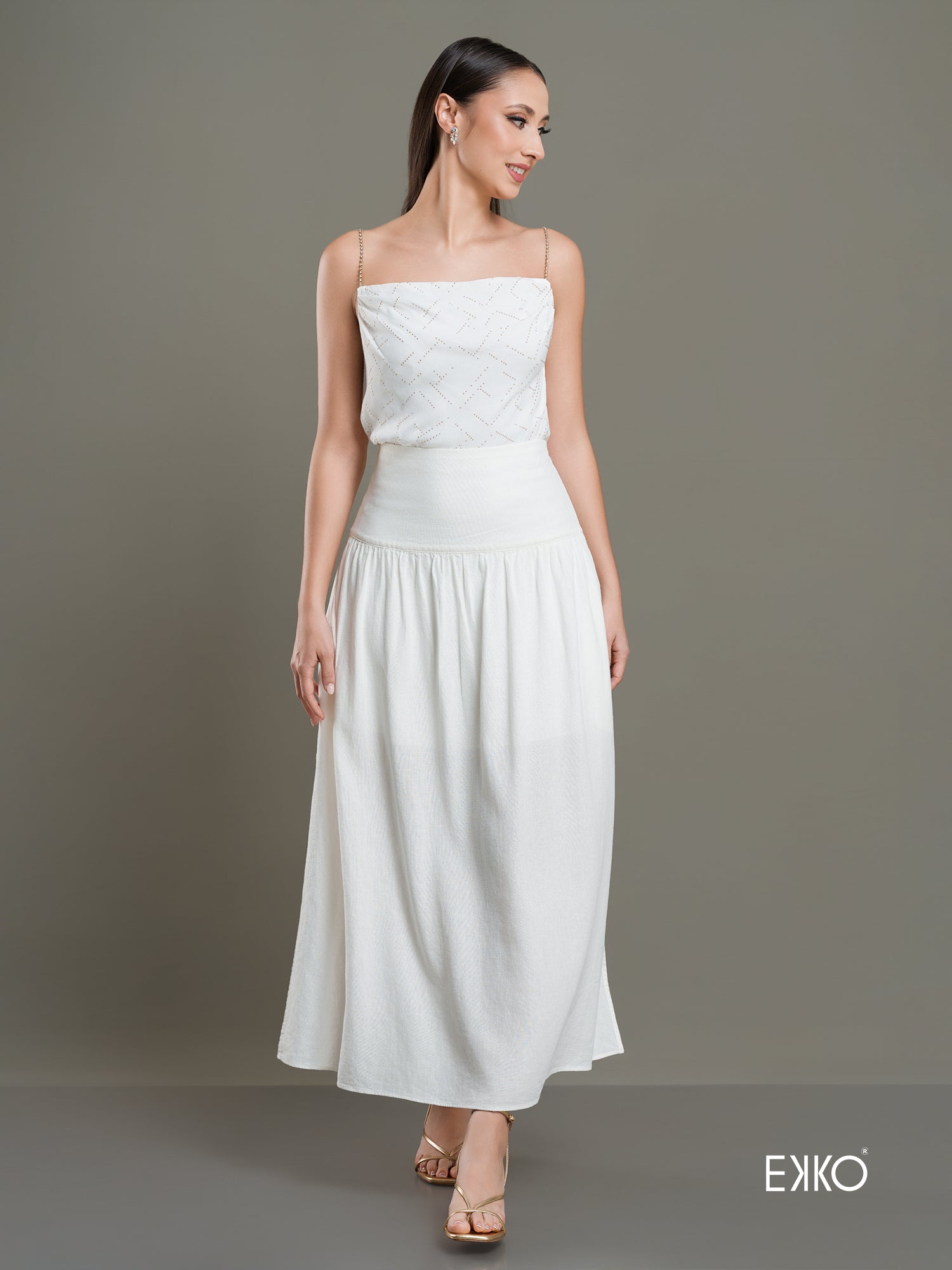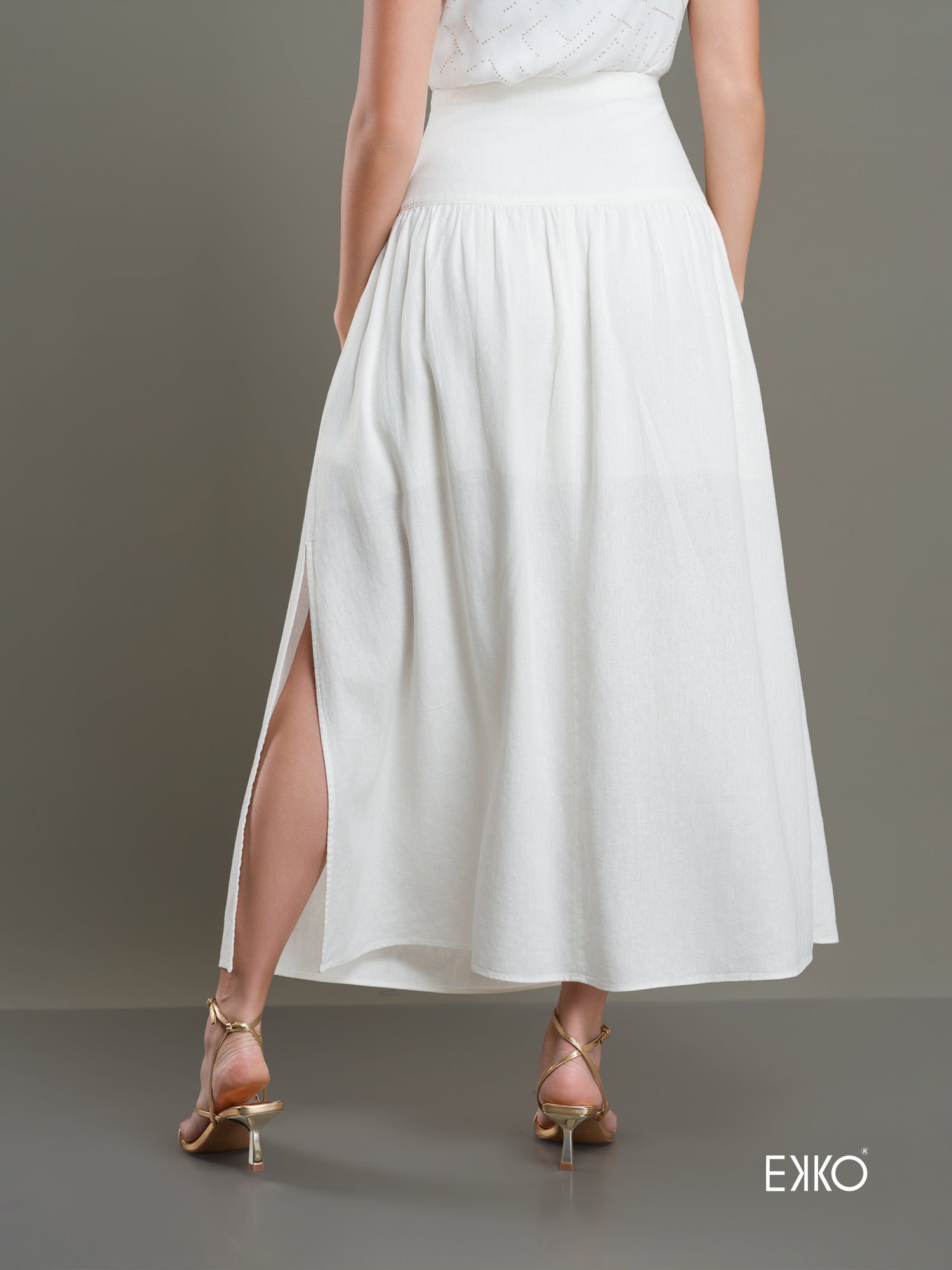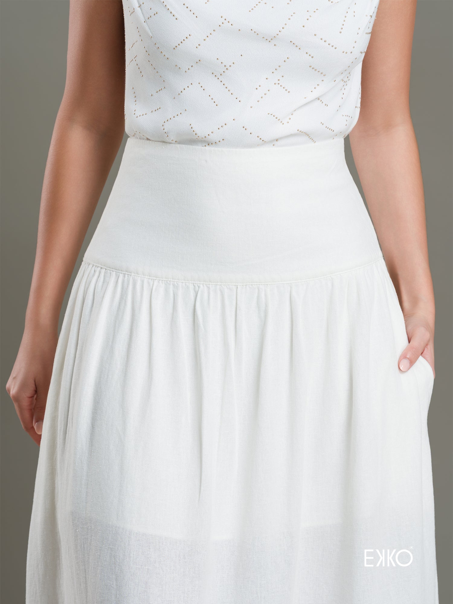 A flowing maxi skirt featuring a wide, structured waistband for a flattering fit. Subtle detailing adds dimension, creating a versatile piece that balances elegance with effortless style.
