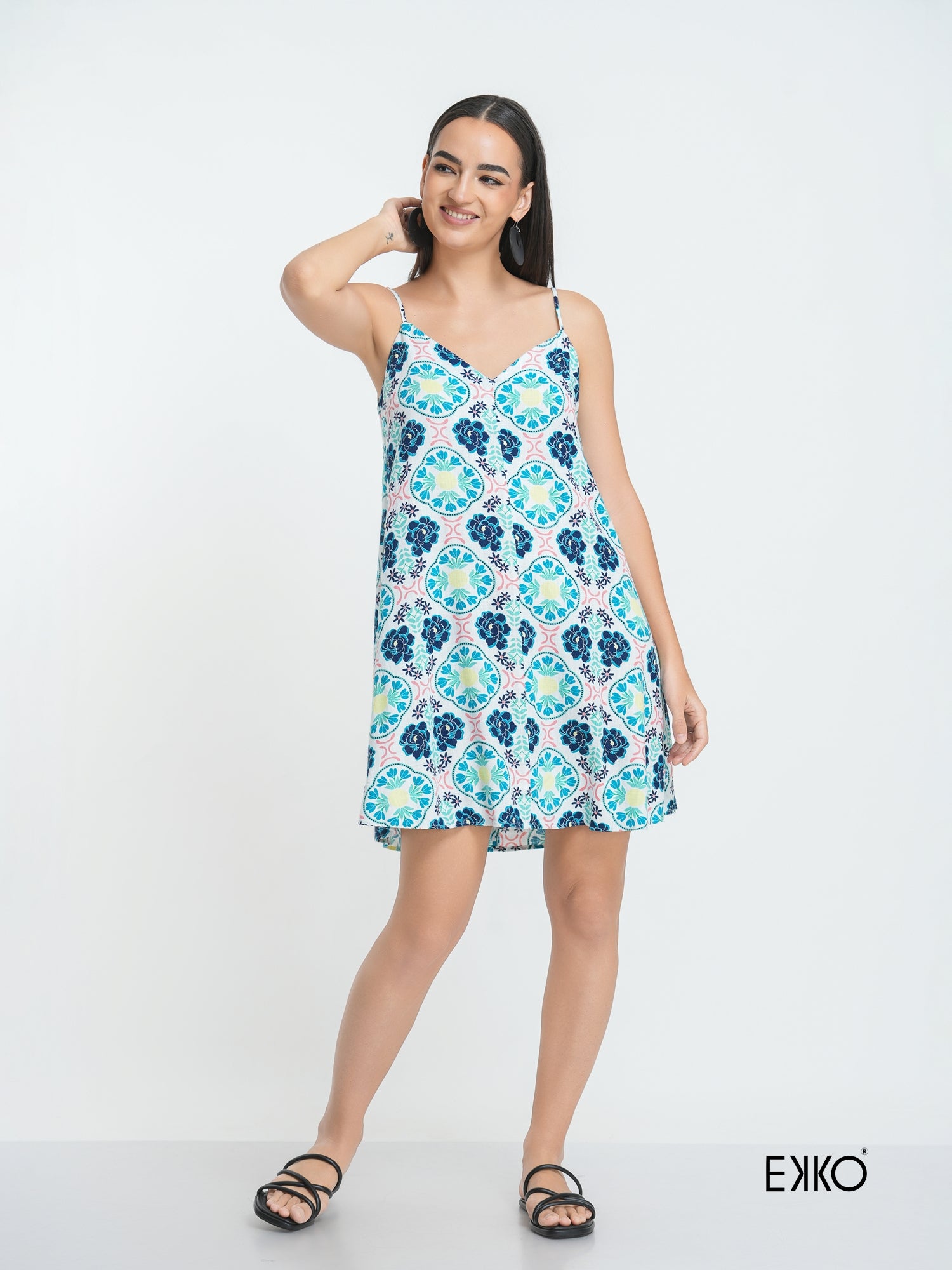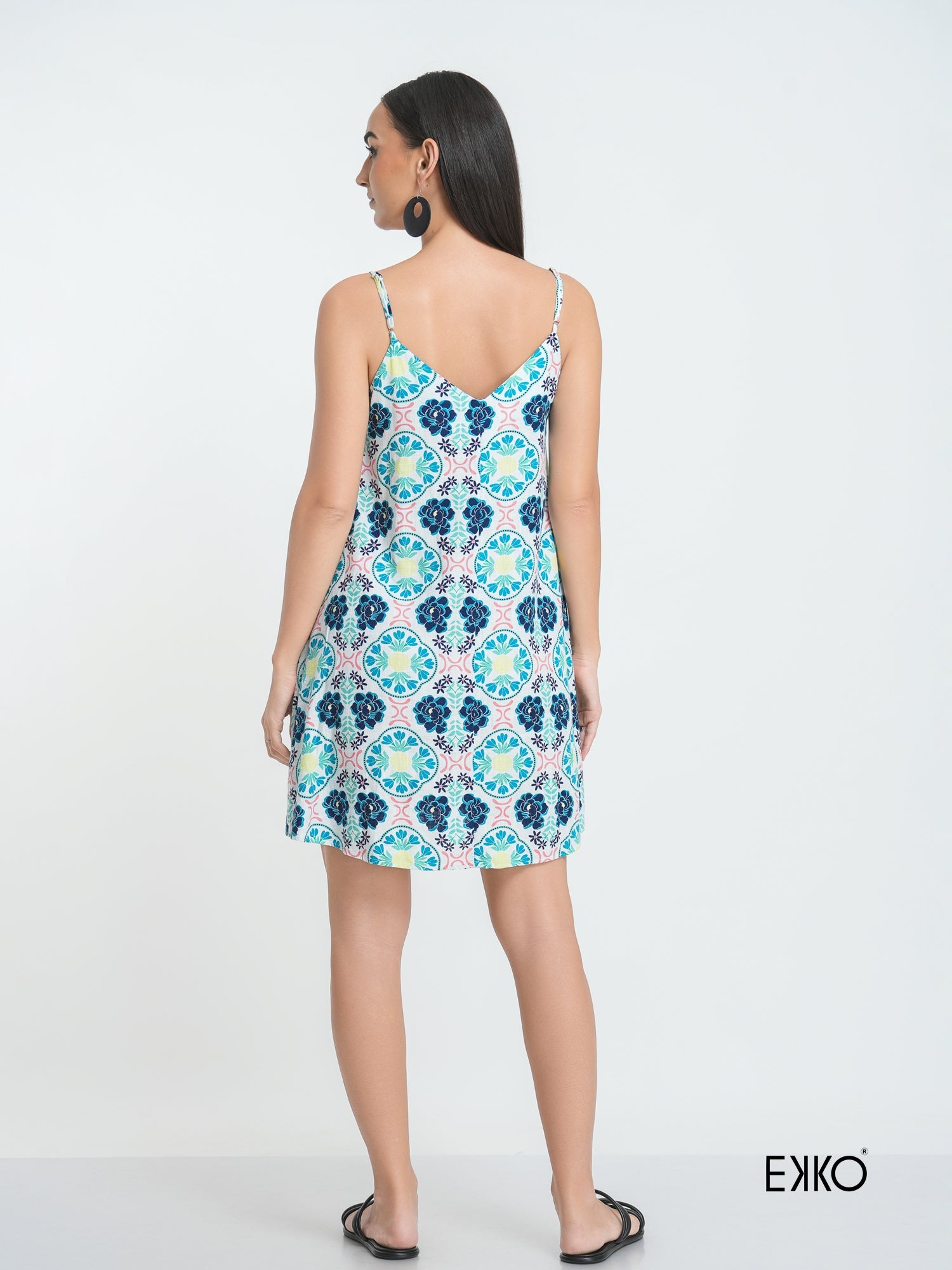 Stay cool and stylish in this strappy printed mini dress. Featuring a relaxed fit and eye catching print, it's your go-to for casual days, beach outings, or laid-back weekends.