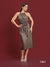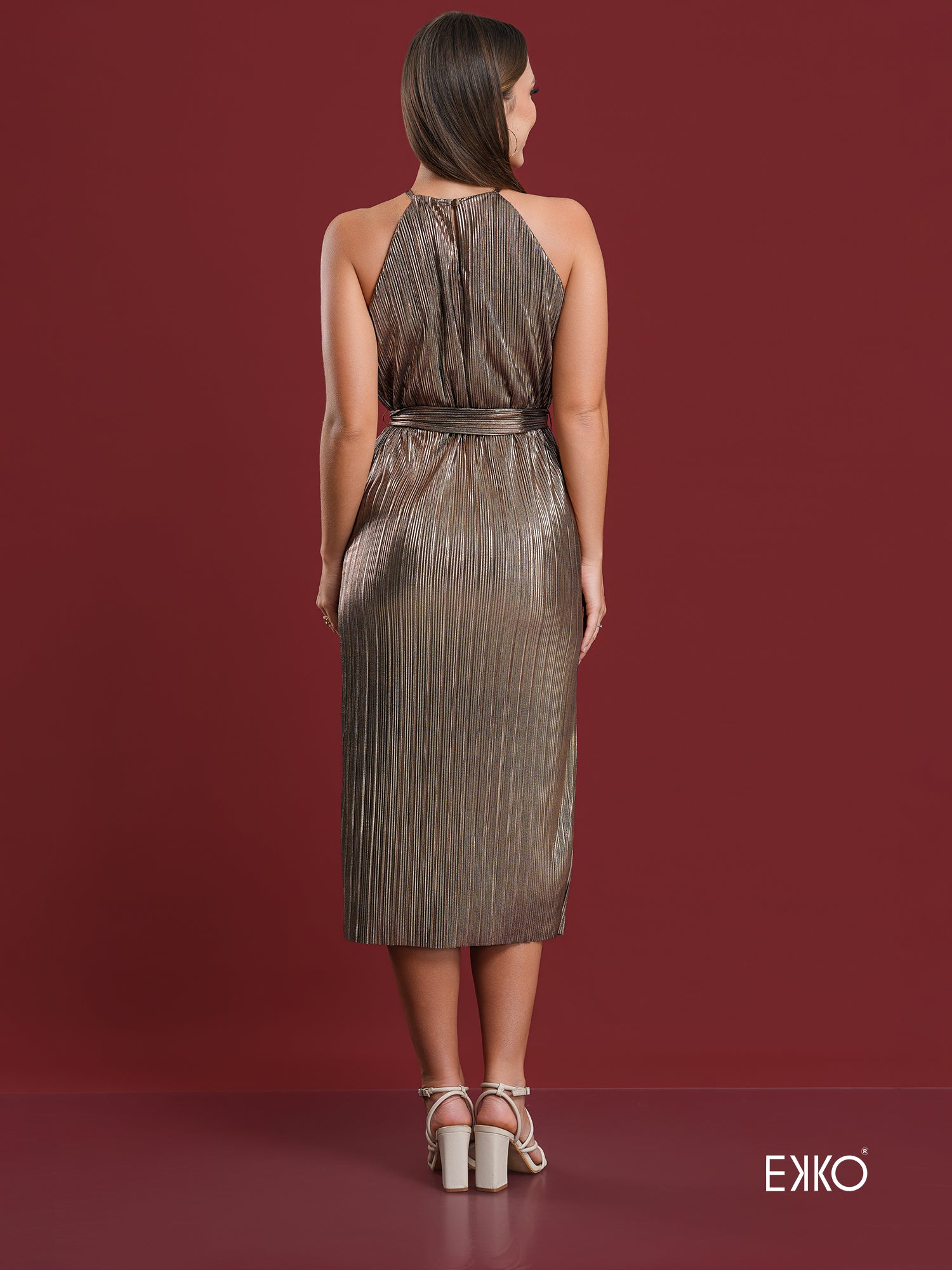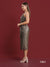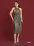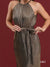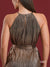 A maxi halter neck dress made out of metallic bronze fabric, designed to elongate the silhouette with regal and luxurious touch, while remaining the comfort and versatility. The halter neck extenuates the shoulders while framing the figure nicely.