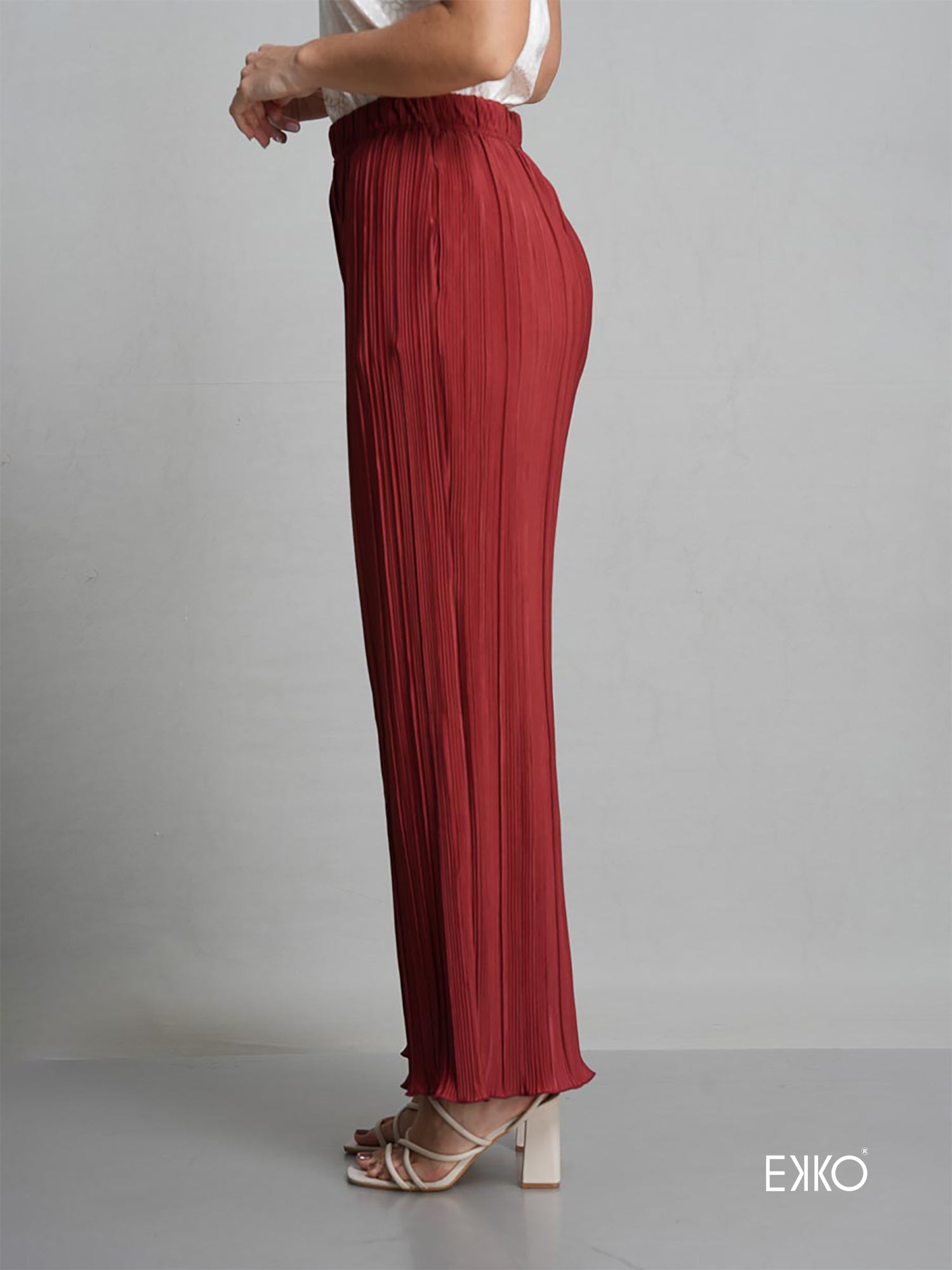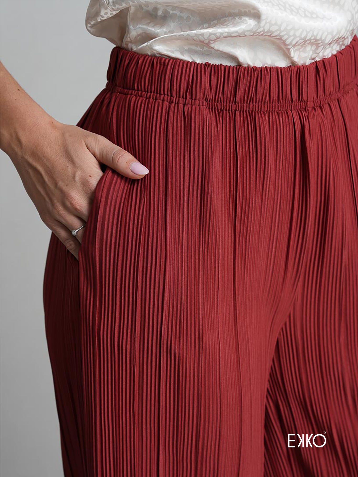 Rona is a straight-leg, mid-waist pant crafted from pleated fabric, offered in versatile red and grey tones. Designed for effortless casual styling, it delivers relaxed elegance with a clean, modern silhouette.