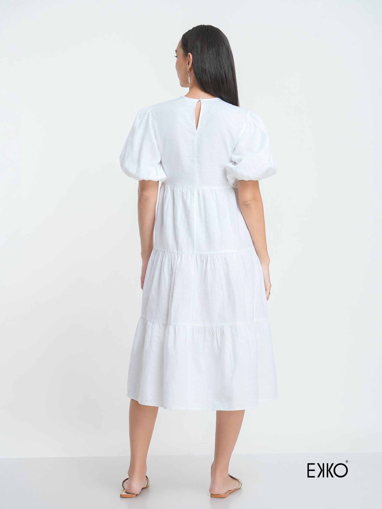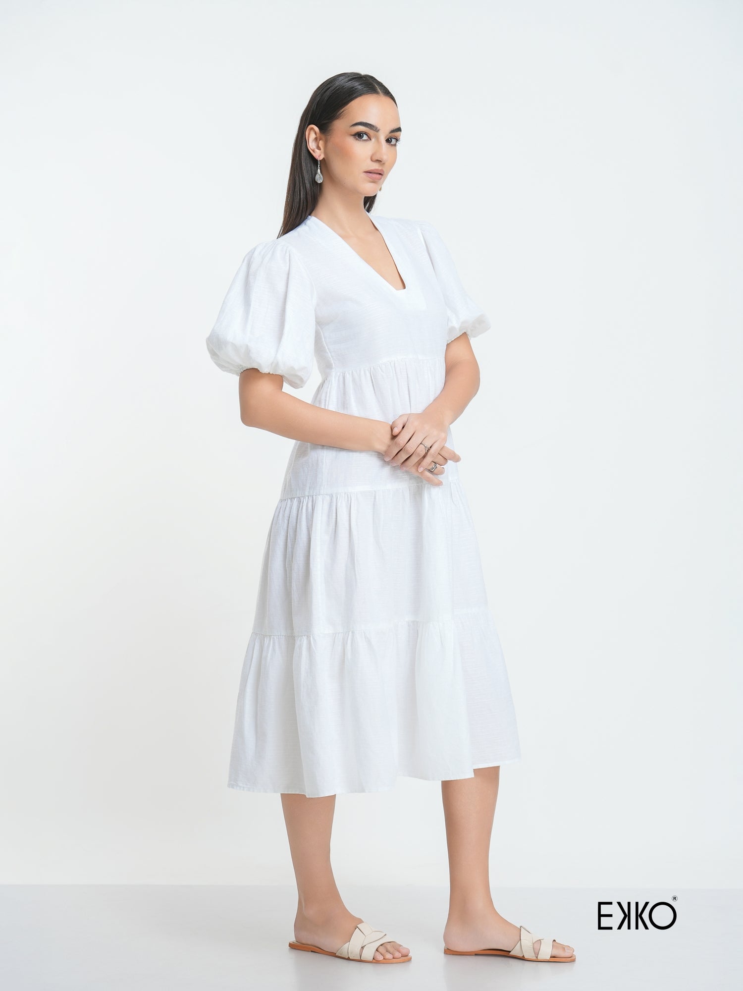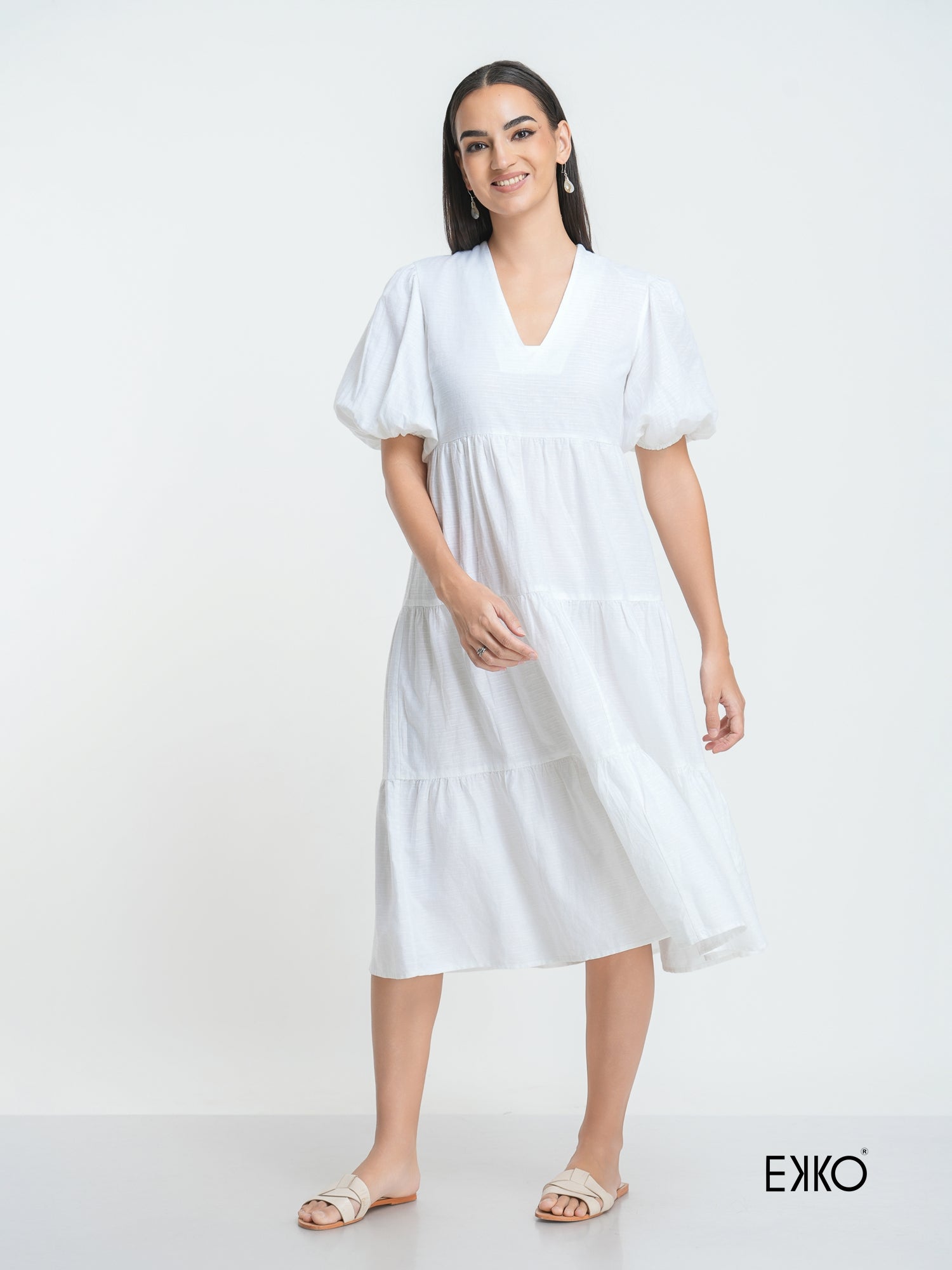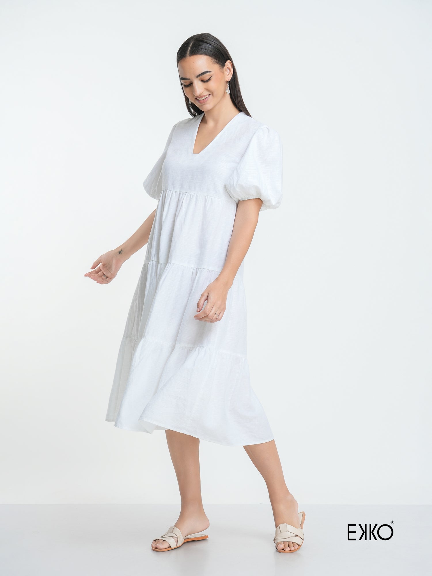 White textured midi dress featuring a flattering V-neckline, short puff sleeves, and a tiered silhouette. Effortlessly chic and perfect for casual, everyday wear.